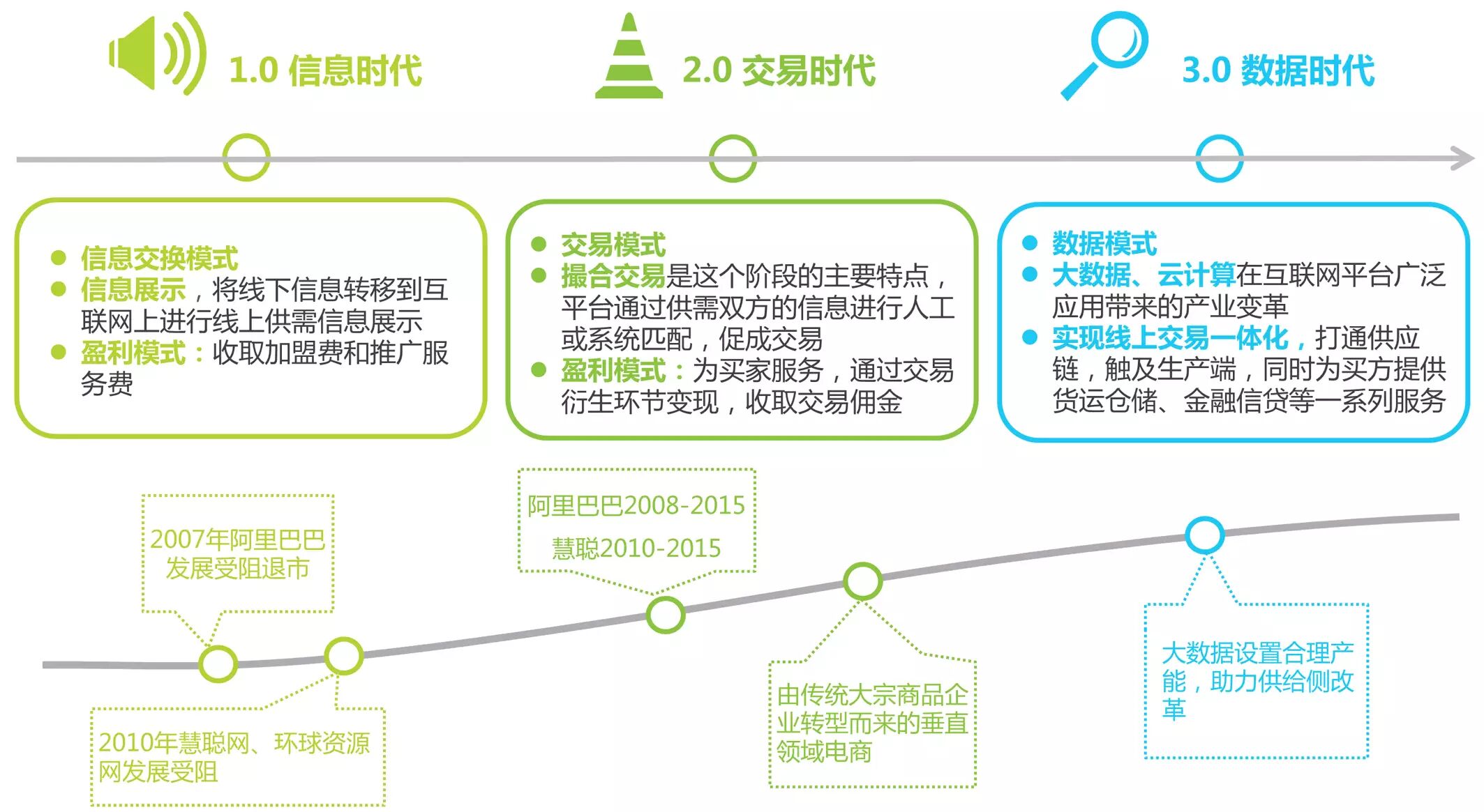 B2B电子商务1.0时代,主要聚焦于信息展示,将线下信息转移到互联网上,网站通过收取加盟费和信息推广服务费盈利;2.0时代,越来越多的企业开始切入交易,通过系统或人工撮合,进行供需信息匹配和在线交易,力图实现交易闭环;3.0时代,随着云计算、大数据的发展,B2B电子商务将打通供应链,为采购双方提供包括仓储、金融信贷等在内的一系列服务。