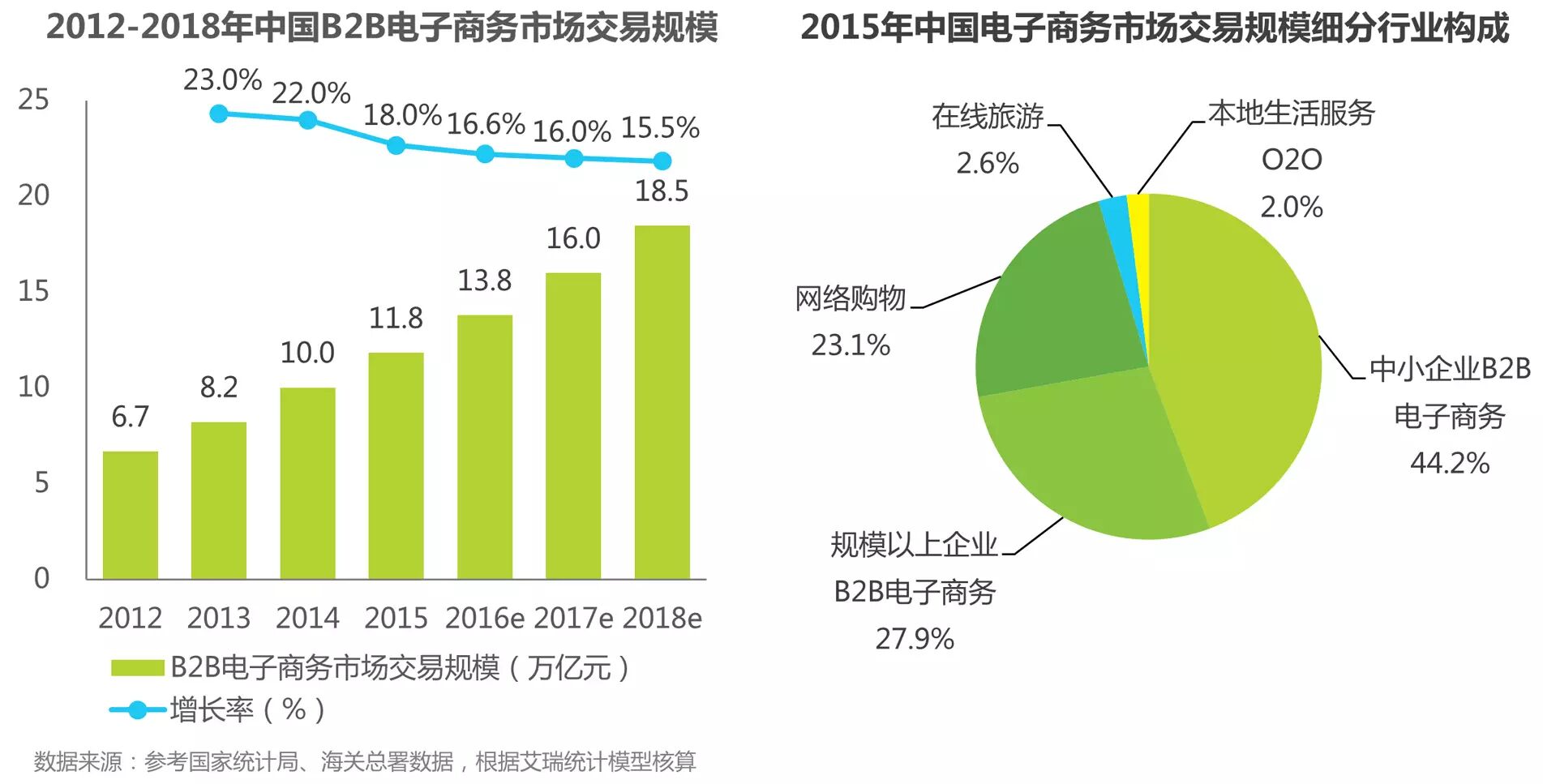 根据艾瑞咨询2015年中国电子商务市场交易数据,2015年中国中小企业B2B电子商务市场交易规模为7.2万亿元,同比增长17.1%;规模以上B2B市场交易规模为4.6万亿元,同比增19.5%。