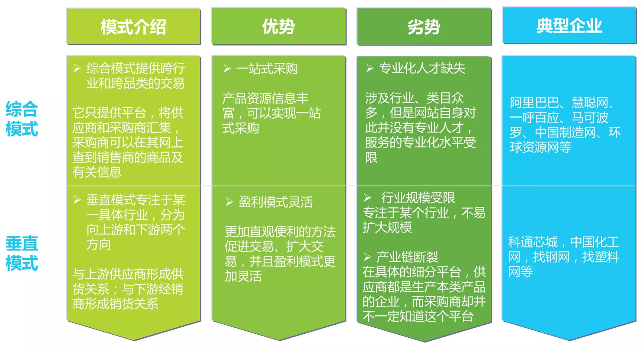 综合模式下,B2B电商既不拥有产品,也不是经营商品的商家,它只提供一个平台,采购双方可以在其网站上查到对方及商品的有关信息;垂直模式下,B2B电商聚焦于某一具体的细分领域,与上游供应商形成供货关系,与下游采购商形成销货关系。