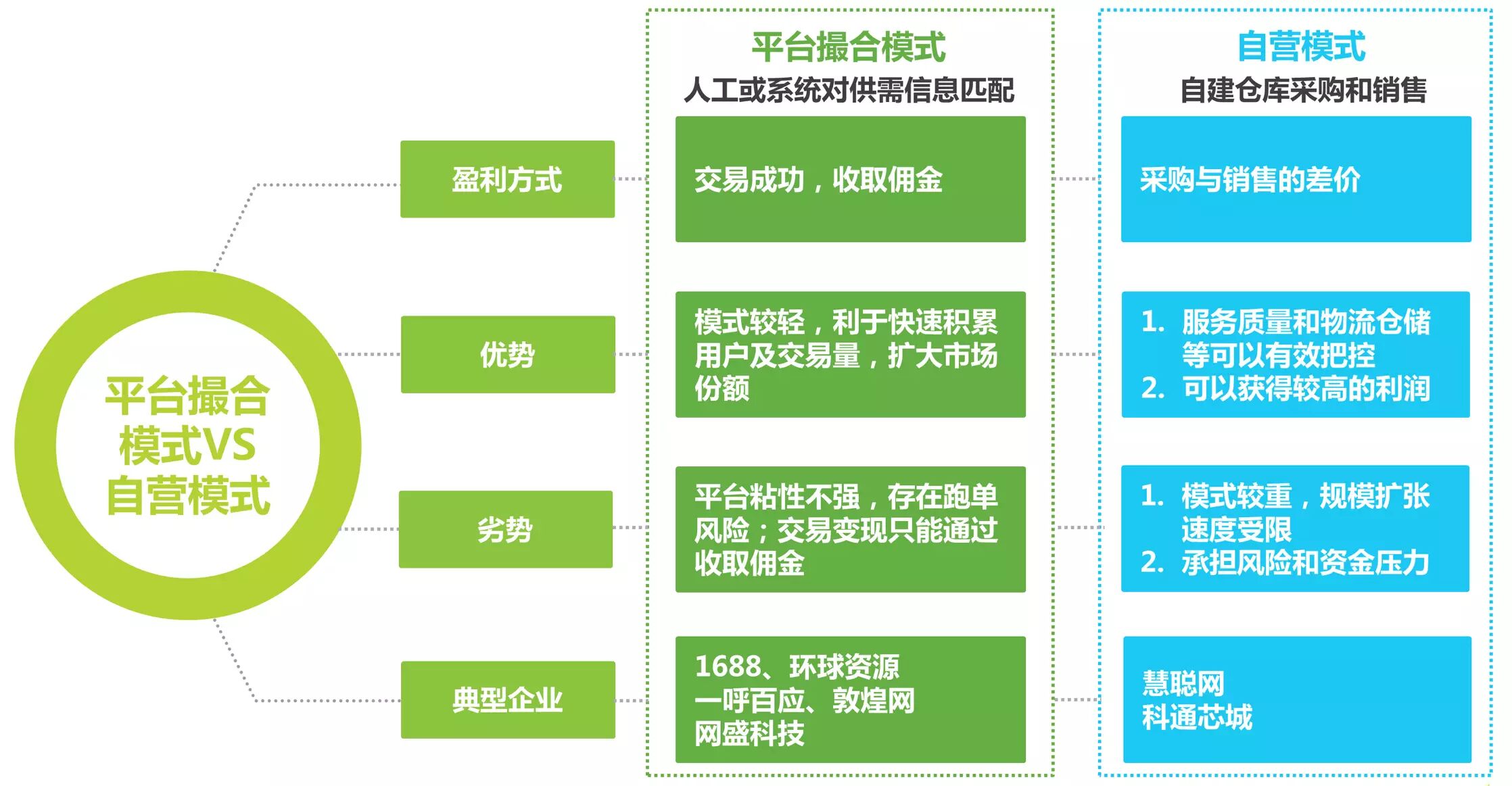 艾瑞分析认为撮合交易模式,模式较轻,更适合产业上下游均比较分散,且下游需求突发性强的产业;自营模式,模式较重,更适合于上游资源较为集中,且下游需求比较稳定的产业。