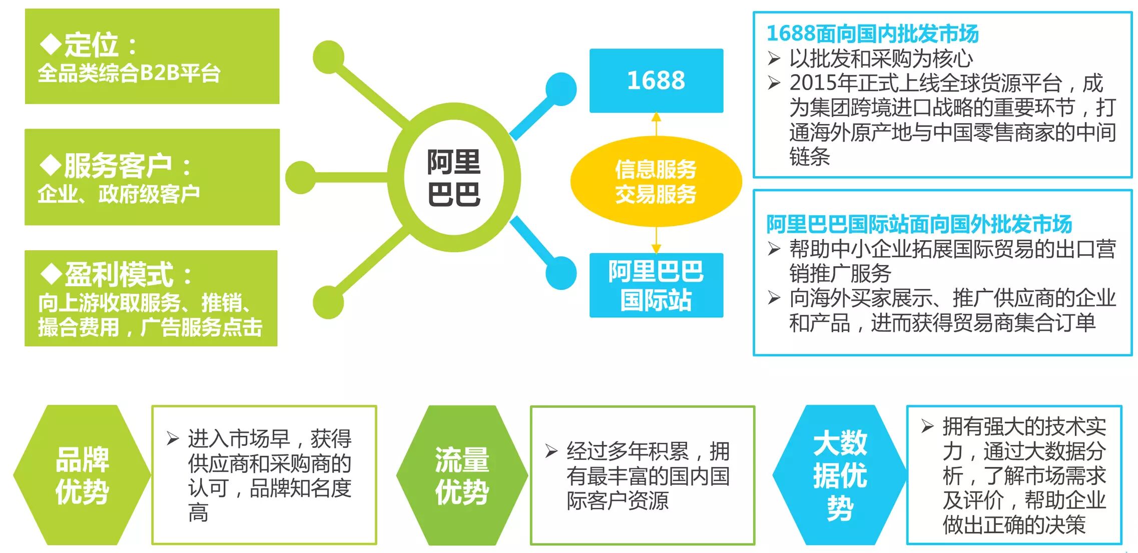 阿里巴巴以内贸开始,主要侧重信息展示;旗下拥有阿里巴巴国际站和1688,其中阿里巴巴国际站面向国际批发市场,1688面向国内批发市场。2015年1688.com正式上线全球货源平台,成为集团跨境进口战略的重要环节,打通海外原产地与中国零售商家的中间链条。