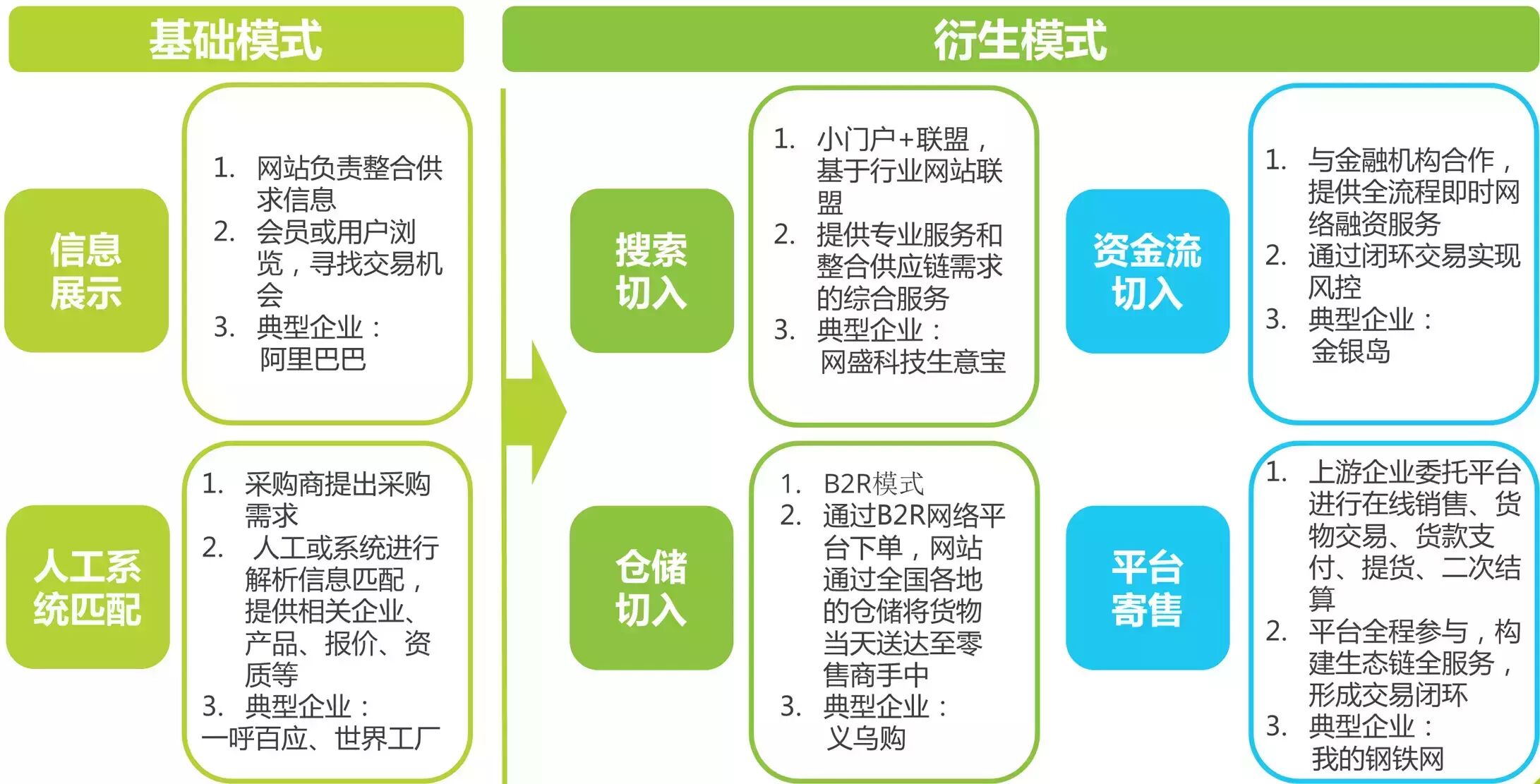 目前中国大多数中小企业B2B电子商务平台采用撮合交易模式,从信息流切入,通过人工或系统匹配,促成采供交易。随着B2B行业的发展,在撮合交易模式的基础上,又涌现出一些创新的模式,主要包括以下几种方式:搜索切入、资金流切入、仓储切入、平台寄售。