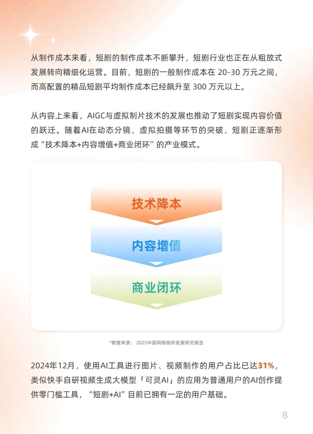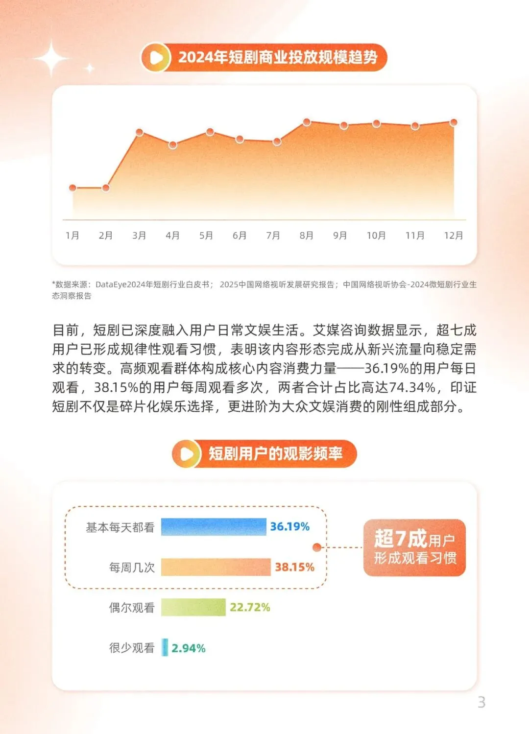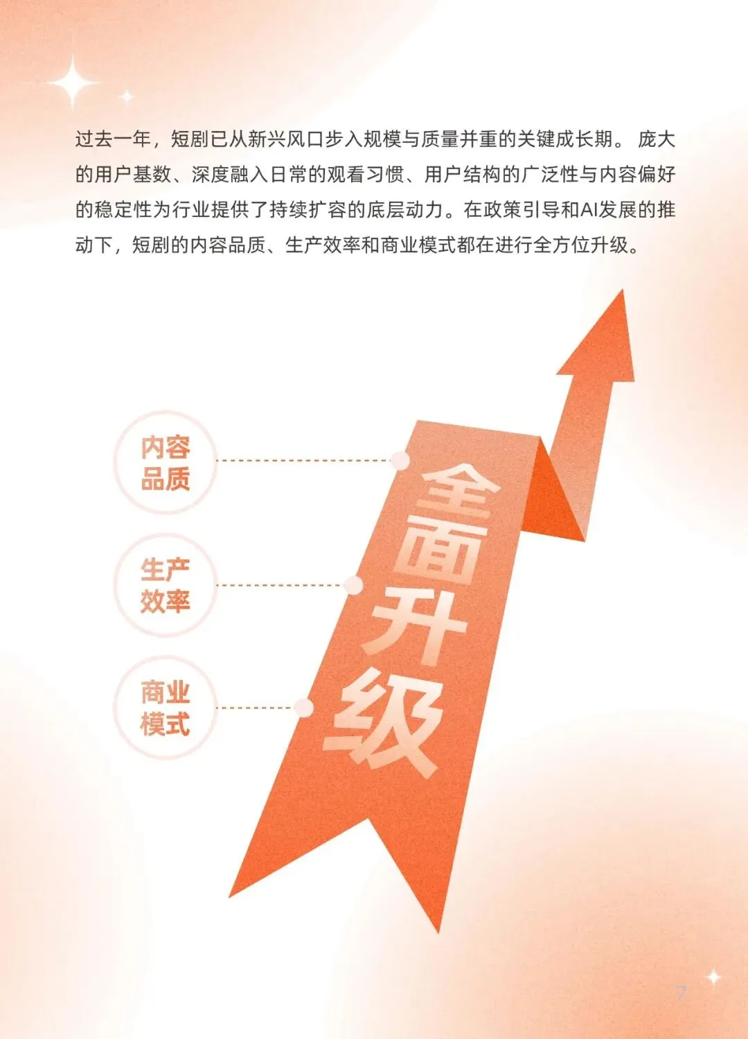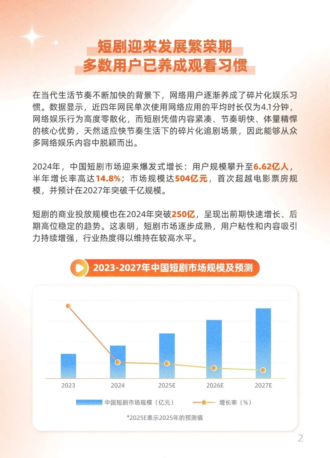 ☝扫码加入会员,海量优质报告下载无限制。报告每日更新,覆盖各行业,查找起来省时省力~⭕关注公众号并回复“营销资料”,可免费获取新人资源礼包1份!短剧行业正迎来质效双升的关键期。2024年,中国短剧市场规模达504亿元,用户规模累计达6.6亿,成为大众文娱消费的刚性组成。其用户结构打破传统壁垒,40岁以下与以上群体占比约1:1,三线及以下城市用户构成主力受众,展现出跨越代际与地域的文化穿透力。1.1 短剧迎来发展繁荣期,多数用户已养成观看习惯1.2 短剧用户代际分布均衡,新线市场蕴含巨大消费潜力03 快手短剧供给稳步增长,精品厂牌持续提升内容品质4.2 男性用户越来越爱看短剧 新线城市带来新增量5.1 IAP+IAA双轮驱动,广告消耗持续破峰