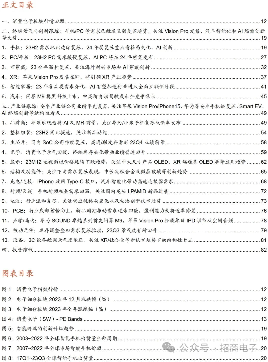 基于本文研究框架与产业数据跟踪,我们认为消费电子产业链景气度已在触底回升,体现在23Q3手机/PC等传统终端在诸多新品发布和去库存结束重启拉货背景下,整体供应链业绩开始恢复并普遍预期24年行业能有小幅成长;另外,行业创新亦在加速,苹果Vision Pro有望开启未来数年空间计算设备及生态机遇,汽车智能化亦在明显加速,AI的兴起亦赋能各终端带来长线发展机遇,我们对消费电子产业的投资机会仍保持乐观,建议关注以下主线:1)苹果链:苹果在未来数年仍是消费电子创新引领者,我们认为24-26年iPhone、可穿戴等单品持续创新和稳定增长将打下基本盘,而Vision Pro及后续空间计算新品将引领行业打开长线空间,甚至长线汽车业务布局亦望看到线索。而国内苹果供应链公司品质较佳且有不少alpha叠加,当前估值整体处于低位,我们继续看好****为首的苹果链优质公司,以及****、****、****、****、****、****、****,以及潜在新入的****等。2)安卓链:把握行业复苏节奏、新品创新以及格局变化。23Q3以来,安卓链整体开始企稳复苏,华为手机的回归,以及小米\传音等在海外市场的成功,均是亮点,不少功能创新如钛合金、微晶玻璃、卫星通信、星闪等引发市场关注;24年整体行业的复苏节奏,以及行业格局变化将是重要关注点,建议关注安卓产业链优质标的,包括****、****、****、****、****等。3)XR:Vision Pro发售在即,把握产业链优质公司。Vision Pro产品在一季度的上市反响将极大程度决定24-25年该产品的扩产节奏和销量弹性,亦将对后续新品迭代产生重要影响,基于对苹果软硬件及生态能力的认知,我们看好苹果Vision Pro及后续空间计算新品打开行业长线空间。建议重点把握参与Vision Pro独家组装及零部件深度垂直一体化的****,摄像头主力供应商****,IPD瞳距调节模组厂商****,金属结构件供应商****,并关注****、****等,如后续销量超预期,则还可关注MR设备链条及关键零部件如硅基OLED链条厂商等,以及非A的XR供应链厂商。4)Smart EV:汽车智能化进入高速发展阶段,高阶智能驾驶正快速落地,华为、小米等科技公司加速入局,软硬件解耦亦驱动新型Tier1诞生,产业链成长空间广阔。我们建议关注深度受益汽车智能化和电动化的优秀公司,例如与奇瑞战略合作并深度参与LUXEED产业链的****,以及智能驾驶、智能座舱、三电系统及其他产业链相关公司。可参考我们前期的《华为汽车产业链深度专题:多维生态赋能车企及供应链,探索Smart EV之界》,报告深度梳理了汽车行业智能化变局中,华为汽车生态的商业模式、竞争优势和产业链投资机遇。5)消费降级:海外消费降级式复苏趋势下,可关注海外新兴市场需求复苏,国内品牌厂商背靠国内完善的供应链制造体系具备竞争优势,建议把握在海外市场具备渠道、品牌、运营、产品性能及价格等优势的品牌厂商,包括****、****、****等。