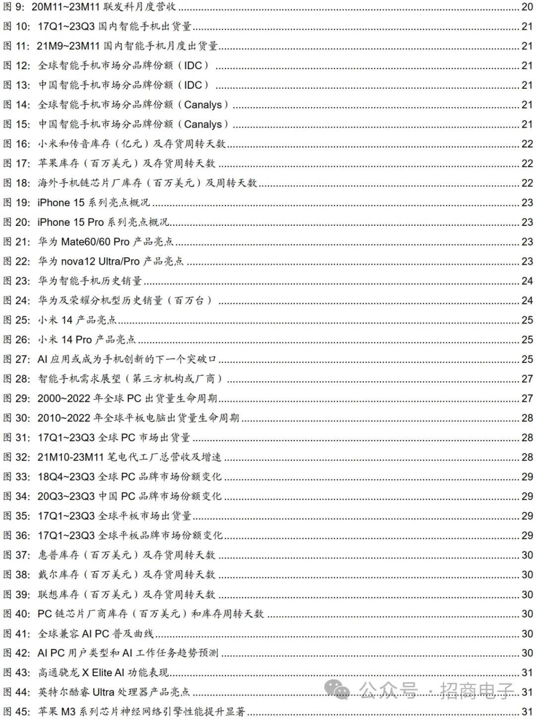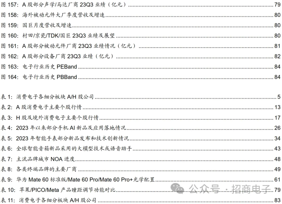终端景气与创新跟踪:手机/PC等需求已触底呈弱复苏趋势,关注Vision Pro发售、汽车智能化和AI端侧创新等大势。1)手机:23H2需求环比边际复苏,24年弱复苏重点看格局变化、AI创新。受益于库存改善及新兴市场复苏,23Q3全球手机出货量同比跌幅收窄至-0.1%;23M8~M12国内安卓机销量迎来同比转正,主要受益于华为/小米/荣耀/vivo等新机驱动;苹果iPhone15新机全球销售表现稳健;产业链总体认为23年手机出货量下降个位数,24年有望弱复苏。创新层面,AI应用或成手机创新下一突破口,生成式AI在端侧逐步落地,搭载大模型手机逐渐面世。2)PC/平板:23H2 PC需求缓慢复苏,AI PC将在24年密集发布。23Q3 PC出货量同比跌幅收窄至-7.6%,23M6~M11笔电代工大厂总营收同比降幅亦持续收窄;库存方面,惠普等终端厂总体认为渠道库存调整基本结束。展望未来,产业链认为PC行业正呈现温和复苏,23年出货量下降约10%至2.5~2.7亿台,24年受AI PC和Windows更新周期驱动有望温和复苏。创新层面,兼容AI功能的PC或改变人类工作方式,Canalys预测27年将有60% PC兼容AI功能,23M10~M12联想/高通/Intel等科技巨头发布AI PC新品并表示看好未来发展前景,AI PC将纷纷在24年正式上市。3)可穿戴:23全年温和复苏,关注海外新兴市场和AI穿戴创新。TWS/智能手表23Q3需求延续回暖趋势,IDC预计23年可穿戴出货量同比+5.6%至5.2亿台,其中TWS为主的耳戴类/智能手表同比+4.5%/+11.3%。分地区看,印度等海外新兴市场可穿戴需求表现强劲,主要受益于中低端产品需求增长。创新方面,我们认为智能手表运动、健康功能有望持续创新,且AI或驱动穿戴设备创新,如穿戴式AI设备AI Pin的发布引发关注。4)XR:苹果Vision Pro发售在即,将引领XR产业趋势。当前VR需求仍低迷,22Q3~23Q3出货量连续第5个季度同比下滑,而23Q3 AR出货量延续增长趋势,主要受益于消费级观影产品贡献。我们认为即将发售的Vision Pro有望开启未来数年空间计算的发展机遇,根据我们跟踪,Vision Pro组装及零部件供应链已于23Q4正式量产,1月下旬望开启预售,如市场反响比较好,有望继续扩产,24年全年销量有望达百万级。5)智能家居:23年各品类需求分化,AI有望加速行业进入全面互联新阶段。23年各品类需求分化,摄像头、扫地机、游戏机需求有一定回暖。23Q3全球TV需求延续低迷,23Q3中国智能音箱销量同比跌幅有收窄趋势,23Q3中国摄像头线上市场销量延续同比增长,23M1~M11扫地机整体呈弱复苏趋势,23M1~M11游戏机销量同比上涨高个位数。我们认为智能家居需求有望逐步回暖,同时AI兴起有望加速行业发展。6)汽车:华为问界M9携黑科技上市,智选车型订单表现亮眼;多家车企获L3级测试牌照,智能网联汽车产业化进程加速。23M12比亚迪/理想销量突破34/5万台,2023全年完成300/30万台销售目标;华为智选车型订单亮眼,截止12月26日问界新M7订单突破12万台,问界M9正式上市7天大定突破3万台;此外小米汽车预计于24H1正式上市。政策方面,23M11工信部等四部门联合印发智能网联汽车准入上路试点通知,目前已有超7家国内外车企宣布获得L3级测试牌照。此外特斯拉开始向员工推送FSD Beta V12,同时FSD入华工作正在推进中,有望催化国内中高阶智能驾驶渗透。产业链跟踪:安卓产业链公司业绩率先复苏,关注苹果Vision Pro/iPhone15、华为等安卓手机链复苏、Smart EV、AI终端创新等结构性看点。1)品牌商:苹果乐观看待AI/MR前景,关注华为/小米手机复苏及新车发布。苹果:预计23Q4营收同比持平,库克表示全球基于Vision Pro开发的应用正不断涌现,期待Vision Pro上市表现。此外苹果表示正持续将AI技术应用于各核心产品中,推进生成式AI工作;华为:Mate 60/X5系列新机仍供不应求,问界/智界多款新车表现突出,此外华为新品亦将接入盘古大模型;小米:23M12小米汽车技术发布会上介绍了小米汽车的电驱/电池/大压铸/智能座舱/智能驾驶五大核心技术,首款车型SU7亮点颇多;传音:受益于新兴市场复苏,2023年收入及利润均创历史新高。2)整机组装:23H2同比提速,关注新品动能。23Q3国内头部组装厂商伴随新机订单导入稼动率持续提升,营收利润均呈现同环比增长趋势,如立讯、比亚迪电子、华勤、光弘等,进入23Q4较为平稳同比仍有较大改善,如立讯凭借自身alpha展望Q4同比明显提速;从台股6家头部代工厂月度数据来看,23M11合计营收10756亿新台币同比+8.6%环比-8.9%,整体同比在提速,且AI服务器订单保持旺盛,广达、纬创、英业达等厂商对24年AI算力需求保持乐观;展望中长期,可关注:a)AI等创新赋能手机及PC等消费终端及下游需求复苏趋势;b)Vision Pro给核心整机厂带来的潜在业绩弹性。3)主芯片:国内SoC公司持续复苏,高通/联发科看好23Q4业绩前景。手机:23Q3以来手机SoC市场需求企稳回升,终端及渠道库存稳定下降,联发科、高通23Q4指引持续向好。联发科预计24年全球智能手机整体出货量增长低个位数;PC:PC SoC下游温和复苏,预计换机周期、Windows系统更新、AI PC趋势将带动24年行业持续回暖。联想、微软、英伟达、英特尔、AMD、高通等纷纷推出AI PC相关产品;IoT:受益于下游可穿戴、智能家居等终端市场需求恢复,国内SoC公司普遍持续复苏。4)光学:受益于安卓手机景气回暖、终端厂商库存去化及新机拉货需求带动,光学公司普遍迎来业绩复苏。舜宇手机镜头/模组23Q3稼动率回升明显,23M10/M11手机镜头/摄像头模组出货量同比持续高增长;中国台湾光学厂商23M10/M11营收同比增长依然强劲,