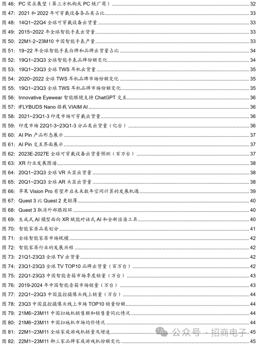 二、终端景气与创新跟踪:手机/PC等需求已触底呈弱复苏趋势,关注Vision Pro发售、汽车智能化和AI端侧创新等大势随着5G、AI等技术的渐臻成熟,电子产品的形态逐步发生转变,多个品类的智能终端在随身、生活、出行等场景中创新不断,正在以多点开花的形式遍布在我们生活当中。我们将对智能手机、PC/平板、可穿戴(智能手表、TWS)、XR、智能家居、智能汽车等终端的景气度与创新进行跟踪。