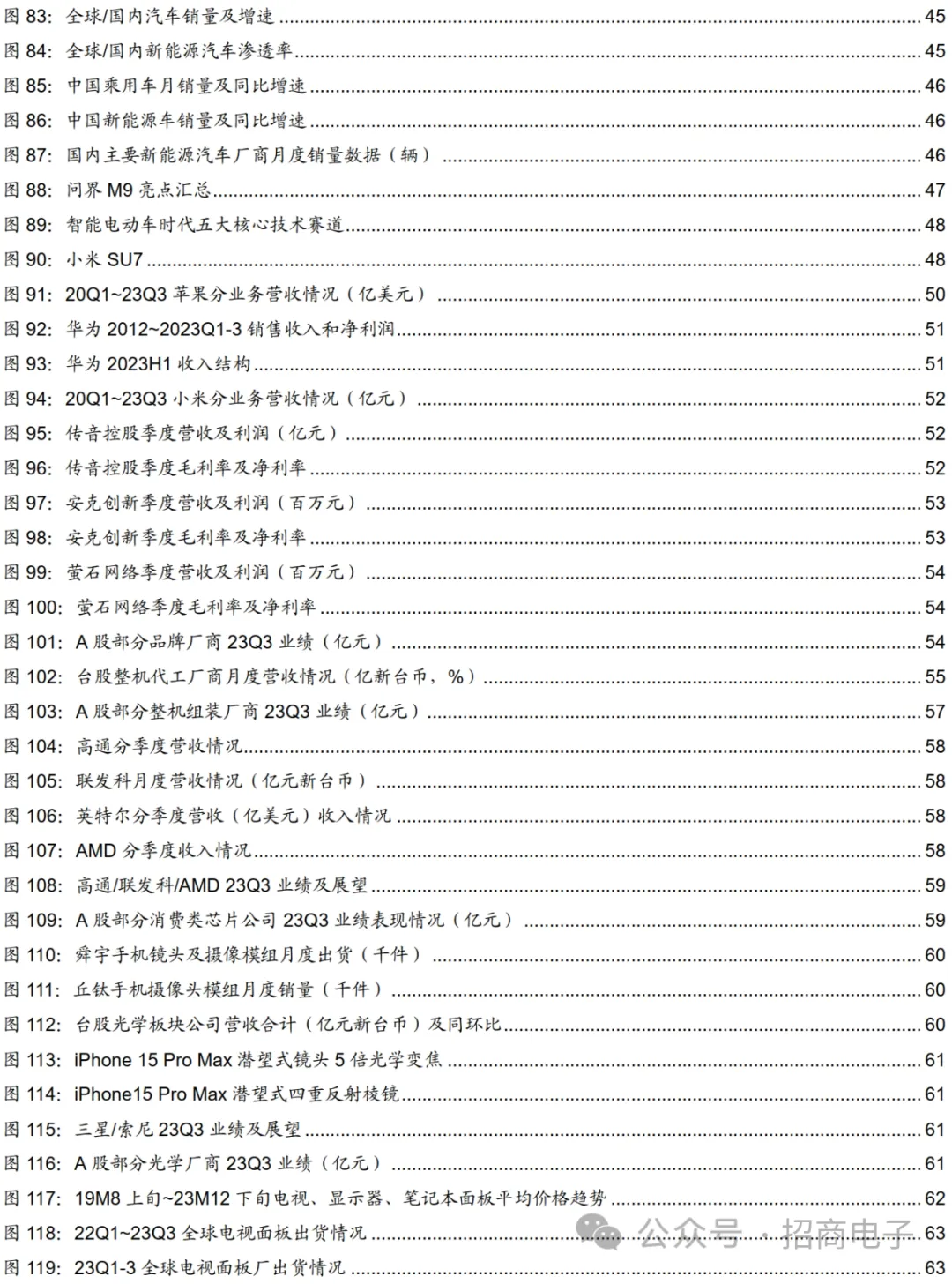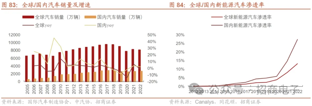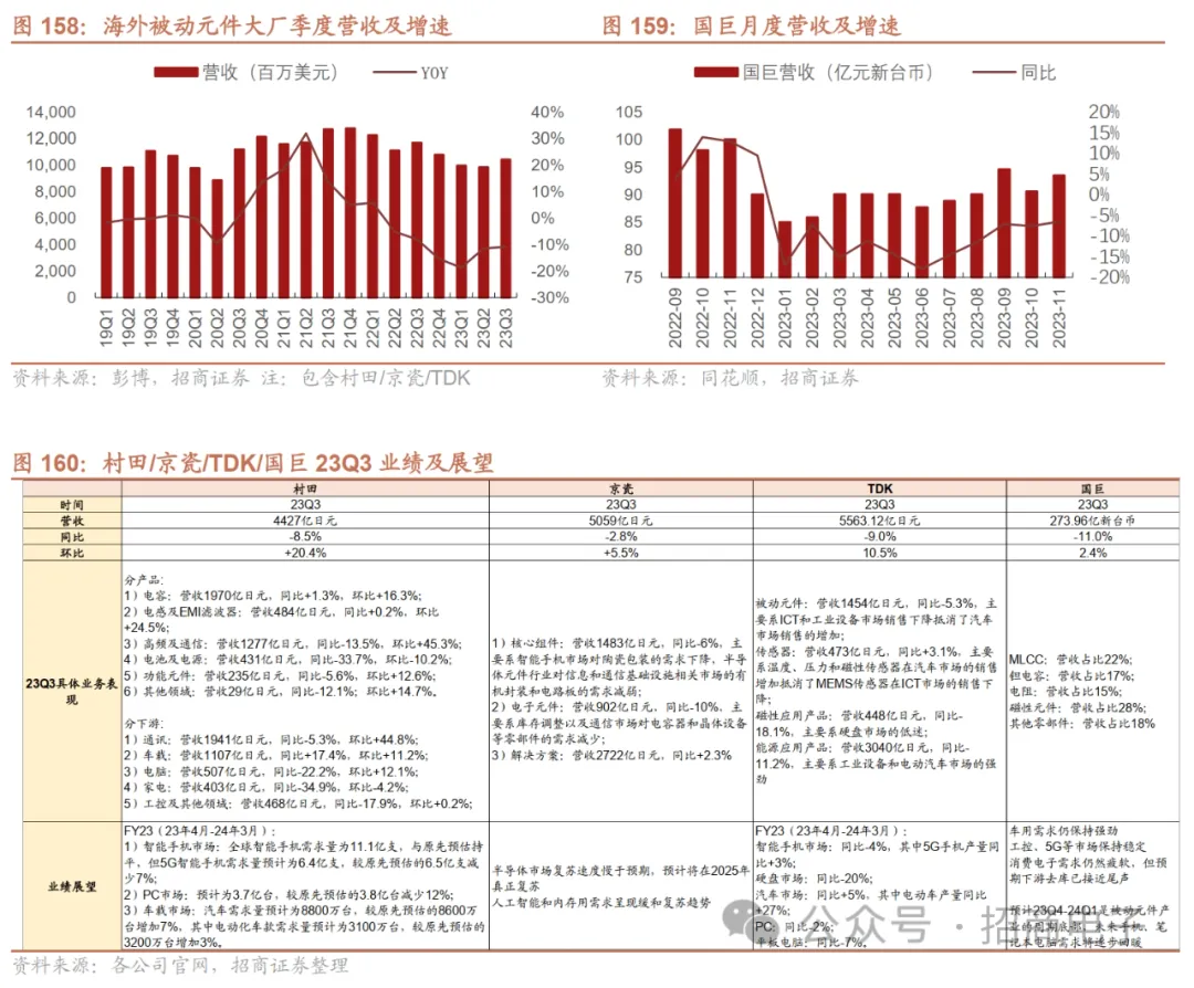 12、被动元件:库存调整叠加需求复苏拉动,23Q3景气度有所回升23Q3被动元件巨头业绩普遍环比上行,看好汽车、AI等中长期增长点。伴随市场库存调整结束、下游客户拉货恢复,被动元件市场需求回暖,23Q2/23Q3村田、TDK、京瓷等被动元件巨头营收和毛利率逐季上行。大厂普遍看好智能电动汽车及AI服务器对被动元件的需求拉动。村田:手机需求旺季驱动Q3通讯市场环比高增,汽车市场有望持续复苏。23Q3公司通讯/汽车/电脑/家电/工控及其他领域营收1941/1107/507/403/468亿日元,同比-12.3%/+13.0%/-28.1%/-27.4%/-17.2%,环比+44.8%/+11.2%/+12.1% /-4.2%/+0.2%。同比来看,汽车市场同比出现高增长,主要受益于汽车出货提升带动电容/电感/传感器等用量增加,其他领域相较22年均出现下滑。环比来看,Q3通讯市场出现环比高增长,主要受益于手机市场旺季驱动通讯领域多层树脂基板/高频模块/电容/电感收入增加;此外汽车、电脑、家电市场均出现一定程度环比增长。展望未来,公司认为1)全球能手机市场已经触底,有望受益于印度、东南亚地区的强劲需求,从23年开始复苏。中低端机型销售有望带动FY24全年整体出货出现低个位数百分比增长。2)PC市场相较22年有好转迹象,但势头并不强,FY23(到24年3月份)总体呈稳定态势,公司对此预期并不高。3)汽车市场23H2订单强劲,受益于半导体供应限制解除、中国市场补贴等因素预计持续复苏至24Q1,关注电动汽车终端降价趋势对上游零部件的潜在影响。公司此前曾表示电动汽车应用将推动未来MLCC等电子零件需求,此外AR装置和AI数据中心的普及亦将起到带动作用。在库存方面,公司认为当前库存水平总体已经优化至适当水平,其中电感的库存去化进度略早于MLCC。若后续市场需求强劲,未来两个季度库存可能略微增加。国巨:23Q3业绩环比小幅改善,24年有望受益于PC市场复苏,长期看好AI发展趋势。公司23Q3营收273.96亿新台币,同比-11.0%/环比+2.4%。分产品来看,MLCC营收占比22%,同比+3pcts/环比持平;钽电容营收占比17%,同比-5 pcts /环比持平;电阻营收占比15%,同比+3 pcts /环比+1 pcts;磁性元件营收占比18%,同比-12 pcts /环比-10 pcts。分领域来看,23Q3工控/车载/电脑/通讯/消费性电子/国防医疗占比约33%/24%/17%/15%/5%/6%,车载应用占比持续提升,成为增幅最大板块。公司预计Q4市场供需不确定性较高,预计下游需求低迷将持续至春节,不过产品价格下跌压力趋缓,手机客户已于23年9月开始持续拉货,PC客户则有望在24年春节后恢复正常的拉货。展望24年,公司预计24年营收增长有望超10%,主要得益于PC市场恢复增长、车用和工控市场保持稳定。公司在AI领域耕耘已久,微软、AMD、Google、NVIDIA等均为下游客户,未来有望受益于AI服务器增长趋势,跟随客户成长。