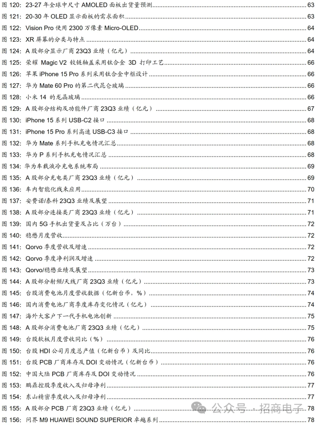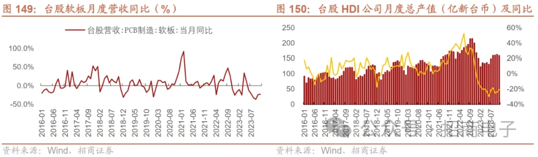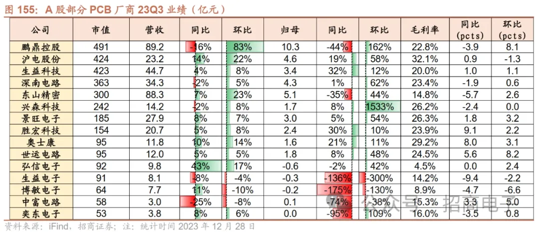 10、PCB:行业底部蓄势向上,新品周期推动需求逐步回暖,盈利能力或将逐季修复下游需求疲软趋势改善有限,PCB行业整体仍处于周期底部,23Q4望迎新品需求。以台股HDI和软板的高频数据来看,23年11月台股HDI厂商营收159.3亿新台币同比-20.4%环比-2.5%,软板厂商营收同比-23.0 %,降幅有所收窄。从台股头部软板公司臻鼎/嘉联益/台郡等大厂23年11月份营收同比增速+25.4%/-42.2%/-24.3%,三家合计11月营收同比+12.4%同比增速转正。HDI大厂华通:23Q3营收195.9亿同比-9.7%环比+41.3%,23年10/11月营收73.2/70.0亿新台币同比-6.6%/-1.4%环比+3.1%/-4.3%,公司23Q3受益于苹果手机、NB等新品上市,9月份进入新品备货周期后月度收入保持环比增长趋势,预估23Q4有望仍环比增长,且23H2地轨卫通领域需求稳健增长,业绩有望逐季改善。