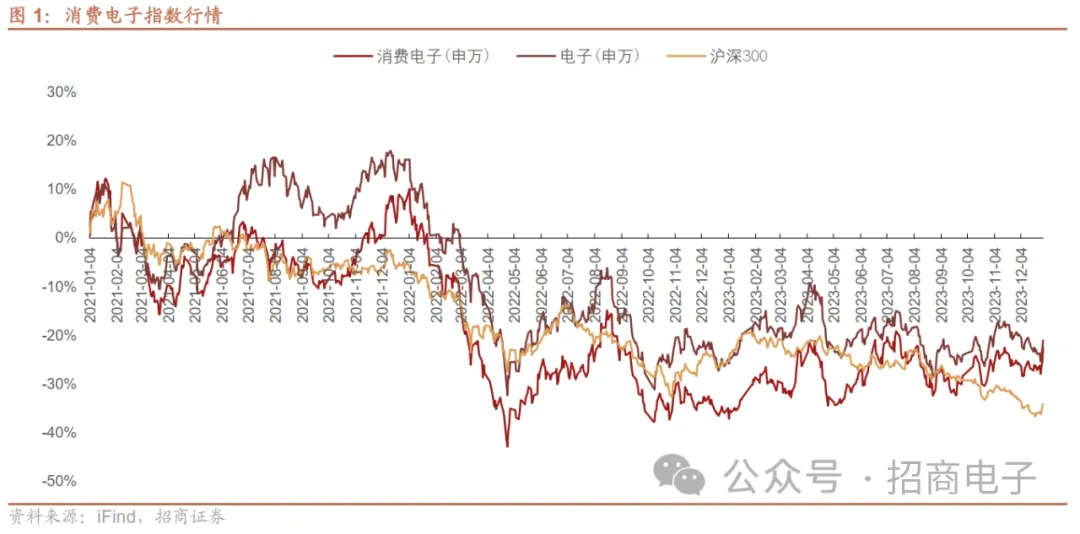 2023年12月,消费电子(SW)行业指数+4.63%,同期电子(SW)行业指数-1.23%,沪深300指数-1.86%;2023年全年,消费电子(SW)行业指数+21.04%,同期电子(SW)行业指数+7.25%,沪深300指数-11.38%。