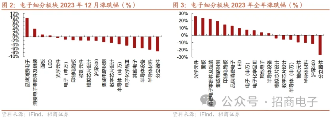 从细分板块来看,2023年12月,品牌消费电子(9.5%)、消费电子零部件及组装(4.0%)、面板(1.0%)、LED(0.6%)、光学元件(0.4%)、印制电路板(-1.5%)、被动元件(-1.7%),同期电子(SW)指数-1.23%,其中品牌消费电子、消费电子零部件及组装、面板、LED、光学元件跑赢电子(SW)指数。2023年全年,光学元件(25.8%)、面板(23.3%)、消费电子零部件及组装(22.1%)、印制电路板(14.4%)、品牌消费电子(12.7%)、LED(9.4%)、被动元件(-9.3%),同期电子(SW)指数+7.25%,其中光学元件、面板、消费电子零部件及组装、印制电路板、品牌消费电子、LED跑赢电子(SW)指数。
