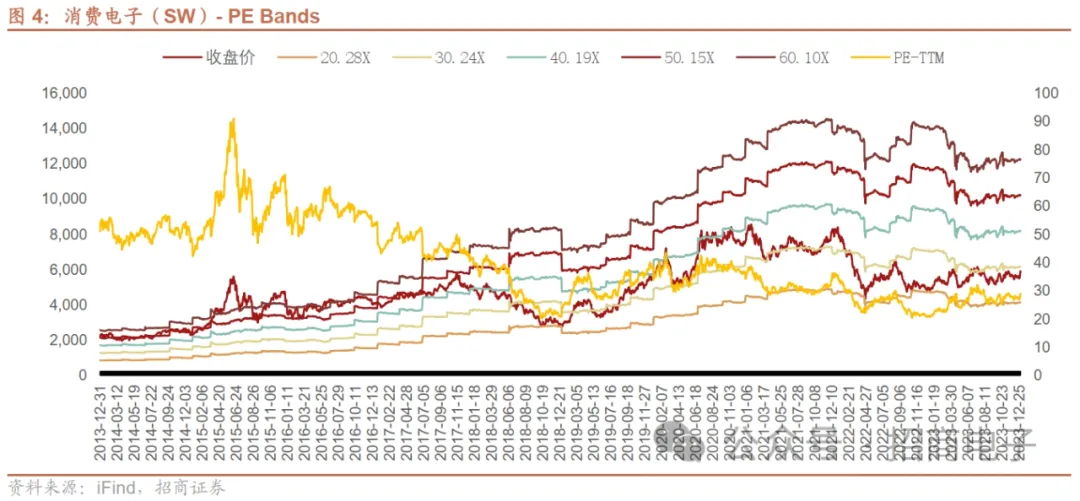 截止到2023年12月底,消费电子板块整体PE-TTM估值从低位区间逐步修复至近29倍,略高于近两年均值。