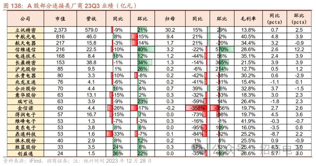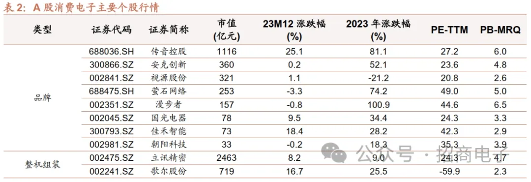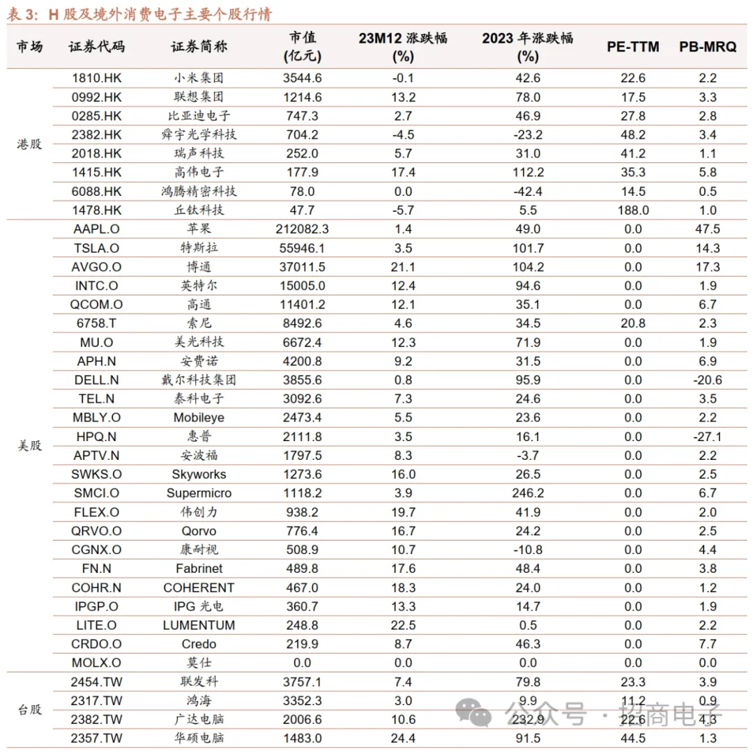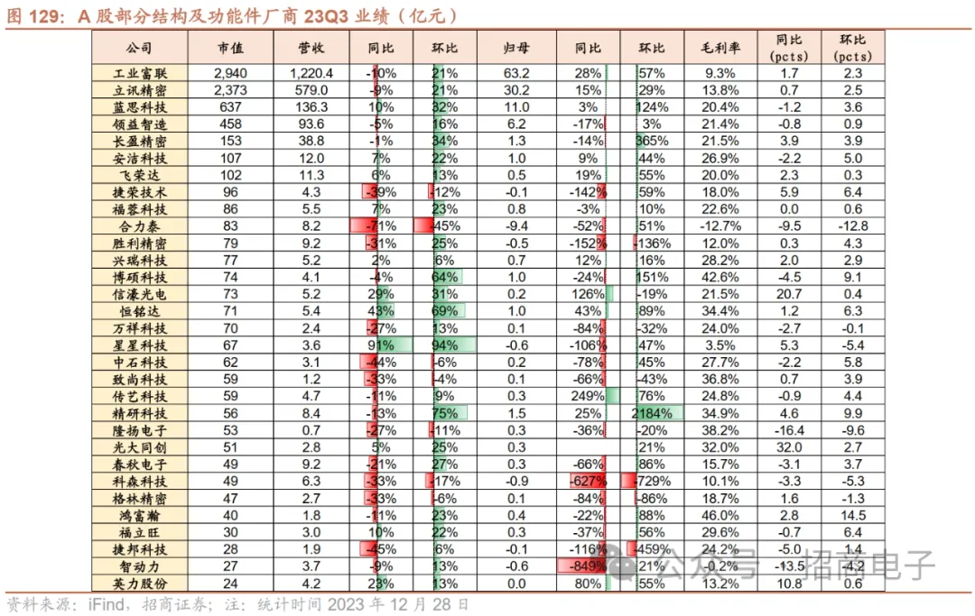 A股个股方面,2023年12月涨幅靠前的前十:亿道信息(+78.9%)、天键股份(+53.7%)、易天股份(+36.1%)、洲明科技(+32.1%)、清越科技(+31.7%)、深科达(+25.9%)、传音控股(+25.1%)、荣旗科技(+21.4%)、捷荣技术(+20.0%)、佳禾智能(+18.4%);跌幅靠前的前十:永贵电器(-20.6%)、维峰电子(-18.7%)、上声电子(-16.2%)、弘信电子(-15.8%)、利和兴(-15.7%)、宇瞳光学(-14.4%)、欧菲光(-14.1%)、合兴股份(-13.4%)、胜利精密(-13.3%)、闻泰科技(-12.3%)。2023年涨幅靠前的前十:捷荣技术(+377.3%)、光弘科技(+170.0%)、兆龙互联(+159.1%)、清越科技(+147.4%)、赛腾股份(+144.4%)、易天股份(+117.5%)、深科达(+117.1%)、杰普特(+109.2%)、艾比森(+101.8%)、信濠光电(+101.4%);跌幅靠前的前十:传艺科技(-53.6%)、瑞可达(-46.9%)、法拉电子(-41.4%)、意华股份(-36.6%)、火炬电子(-34.7%)、上声电子(-33.3%)、德赛电池(-31.5%)、宏达电子(-30.8%)、欣旺达(-29.9%)、江海股份(-27.6%)。