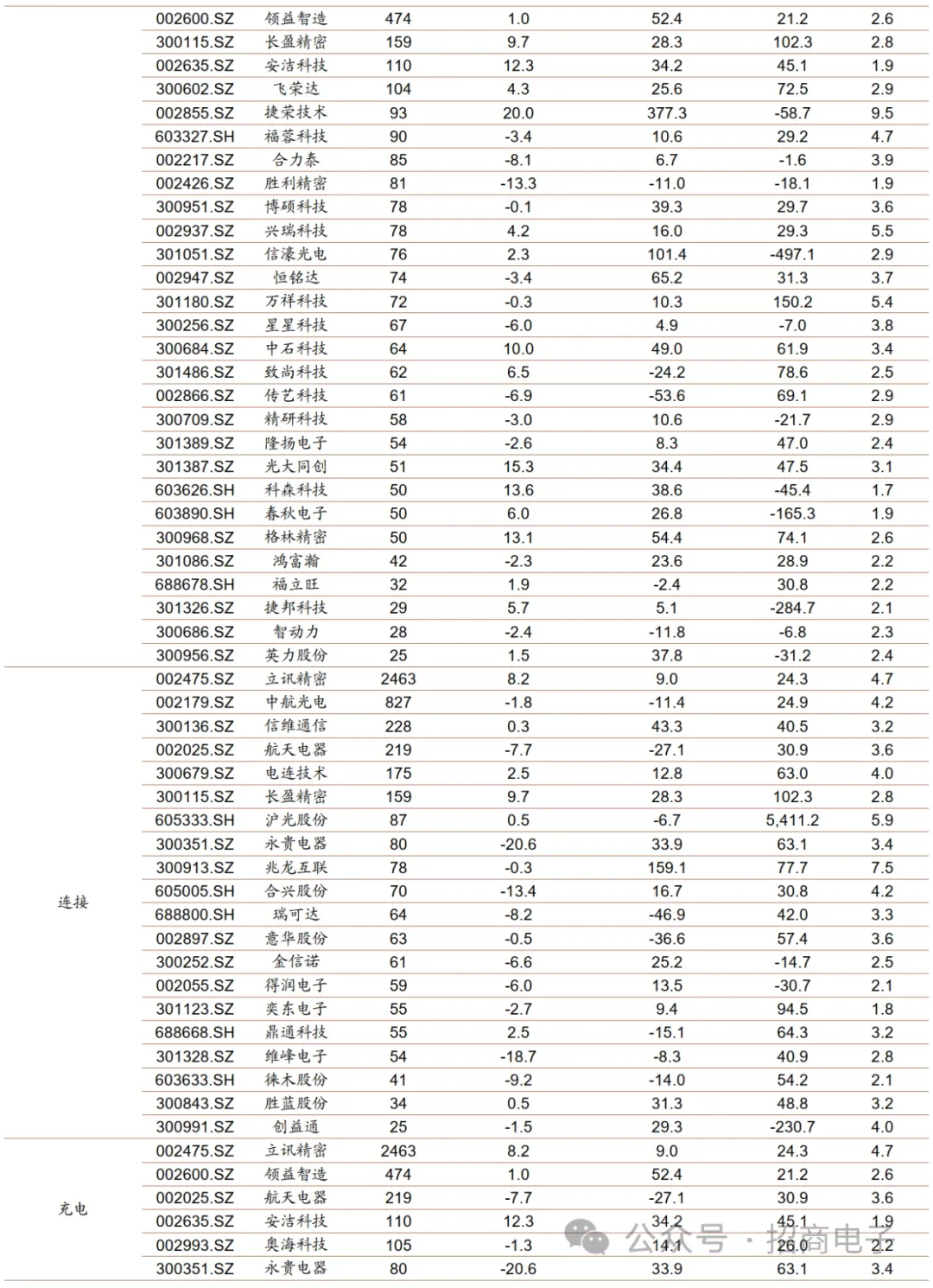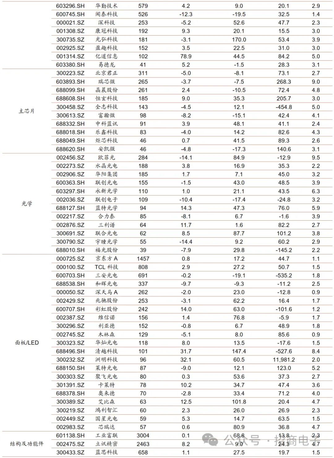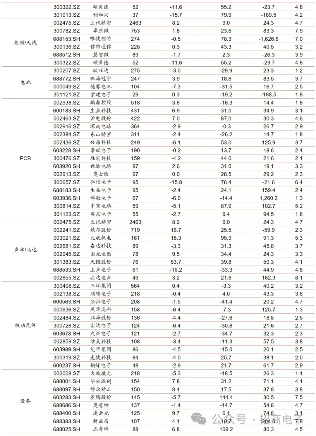 A股个股方面,2023年12月涨幅靠前的前十:亿道信息(+78.9%)、天键股份(+53.7%)、易天股份(+36.1%)、洲明科技(+32.1%)、清越科技(+31.7%)、深科达(+25.9%)、传音控股(+25.1%)、荣旗科技(+21.4%)、捷荣技术(+20.0%)、佳禾智能(+18.4%);跌幅靠前的前十:永贵电器(-20.6%)、维峰电子(-18.7%)、上声电子(-16.2%)、弘信电子(-15.8%)、利和兴(-15.7%)、宇瞳光学(-14.4%)、欧菲光(-14.1%)、合兴股份(-13.4%)、胜利精密(-13.3%)、闻泰科技(-12.3%)。2023年涨幅靠前的前十:捷荣技术(+377.3%)、光弘科技(+170.0%)、兆龙互联(+159.1%)、清越科技(+147.4%)、赛腾股份(+144.4%)、易天股份(+117.5%)、深科达(+117.1%)、杰普特(+109.2%)、艾比森(+101.8%)、信濠光电(+101.4%);跌幅靠前的前十:传艺科技(-53.6%)、瑞可达(-46.9%)、法拉电子(-41.4%)、意华股份(-36.6%)、火炬电子(-34.7%)、上声电子(-33.3%)、德赛电池(-31.5%)、宏达电子(-30.8%)、欣旺达(-29.9%)、江海股份(-27.6%)。