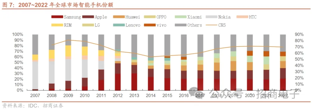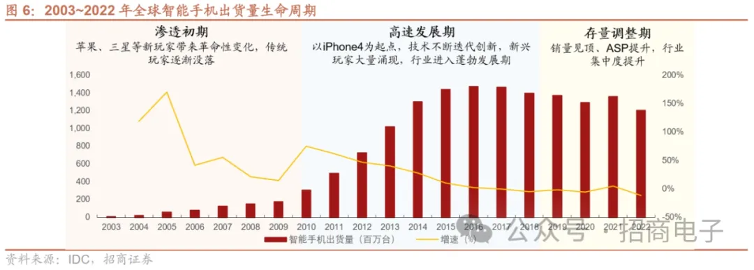 1、手机:23H2需求环比边际复苏,24年弱复苏重点看格局变化、AI创新目前智能手机行业处于存量调整期,2014年后行业集中度提升。以iPhone4为起点,技术不断迭代创新,智能手机行业进入高速发展期。经过十余年的高速发展,目前智能手机行业处于存量调整期。2014年后行业集中度提升,目前主要玩家包括苹果、三星、小米、OPPO、vivo、华为、荣耀、传音等。 2022年智能手机出货量同比-11.3%至12.1亿部,苹果表现优于安卓。据IDC,在消费需求疲软、通胀高企等多重因素影响下,2022年全球智能手机出货量同比-11.3%至12.1亿部,其中iPhone出货量同比下降4.0%,国内安卓品牌跌幅较大,小米、OPPO、vivo出货量同比下降20%左右。