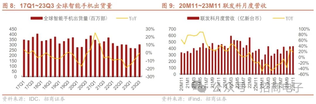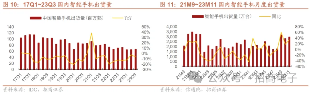 23Q3全球智能手机出货量同比跌幅收窄,受益于库存改善及新兴市场复苏。据IDC,23Q1~Q2全球智能手机出货量分别同比-14.6%、-7.8%,23Q3同比跌幅进一步收窄,同比-0.1%至3.028亿部,主要系厂商在23Q2库存状况得到改善,并在23Q3推出新品。其中,欧洲、日本和美国的出货量分别下降8.6%、5.3%和1.1%,中东和非洲、拉美洲以及亚太地区(不包括日本和中国)等新兴市场的出货量分别增长18.1%、8.2%和1.3%。手机SoC龙头联发科23Q3营收1101亿新台币,略高于指引上限,主要受益于手机业务补库及新品推出,23M10营收428亿新台币,同比增长28.2%,23年来首次增速回正,23M11延续近20%同比增长。23M8~M12中旬国内安卓机销量迎来同比转正,受益于华为、小米、荣耀等新机发布及库存端改善。从国内安卓手机需求来看,华为Mate 60/X系列、小米14系列和荣耀/vivo等新机的陆续发布引发了用户换机需求,23M8~M12中旬国内安卓机销量迎来同比转正,整体需求呈现边际持续复苏的态势。据Counterpoint,中国智能手机市场销量在双11两周期间与22年同期相比增长5%。据信通院,11月国内智能手机出货量2985.6万部,同比增长34.4%,1-11月出货量累计2.50亿部,同比增长5.4%。