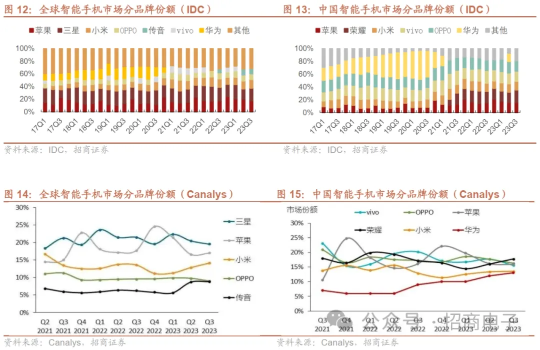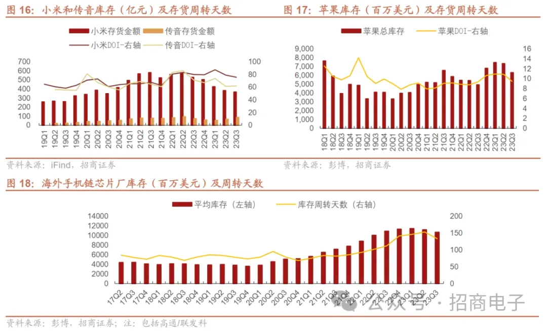 分品牌来看,1)全球市场:23Q3苹果表现相对稳健,传音连续两个季度跻身Top5。据IDC,23Q3 Top5品牌三星、苹果、小米、OPPO、传音出货量5950、5360、4150、2700、2600万部,同比-8.4%、+2.5%、+2.4%、-6.5%、+35.0%,苹果表现相对稳健,在新兴市场强劲增长的推动下,iPhone业务营收创下23Q3季度的历史记录,活跃安装基数达历史新高;传音主要受益于非洲市场复苏以及拉美等其他市场的扩张连续两个季度跻身前五。2)国内市场:23Q3荣耀重返首位,华为出货量逼近第五。据IDC,23Q3 Top5厂商荣耀、OPPO、苹果、vivo、小米出货1268、1064、1051、1031、887万部,同比+1.8%、-10.5%、-4.0%、-25.7%、+0.1%,荣耀重返首位得益于3款折叠新品、X50系列表现较佳。华为Mate 60系列/X5手机23M8底发布以来销量火爆,据Canalys,22Q3以来华为在国内市场份额持续攀升,23Q3份额升至近13%逼近第五厂商。库存端来看,安卓手机终端库存去化顺利,23Q3恢复拉货加速供应链库存消化。联发科:在23Q3电话会表示过去几个月整体渠道库存持续改善,尤其在手机方面,已连续5个季度减少库存。截至23Q3末,库存周转天数回到90天的健康水平,预期库存在未来几个季度将继续改善。高通:在23Q3表示库存调整已经结束,安卓渠道库存正常化。Qorvo:在23Q3电话会表示渠道库存情况持续改善,目前安卓手机厂商表示库存已接近历史正常水位,甚至去化速度比公司预期的23年底去化完要更早。小米:在23Q3电话会表示从22年初以来,公司一直在优化库存管理,23Q3存货金额368亿元,同比下降30.5%,为11个季度以来最低的库存水位。手机上游物料供应链在23Q3开始看到库存加速消化。