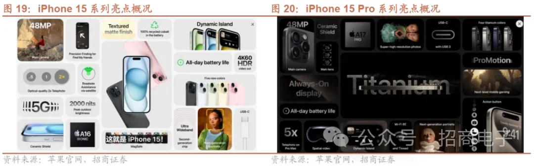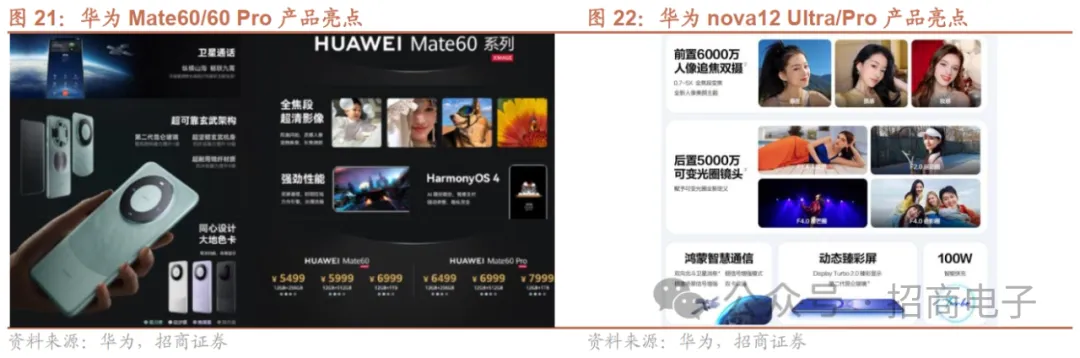 新机发布来看,iPhone15系列主要在芯片、外观、摄影、连接性及接口方面有所升级。1)升级为4nm A16仿生芯片;2)外观:采用灵动岛药丸屏设计,更窄黑色边框;屏幕亮度达到2000尼特,为14系列的两倍;3)摄像系统:主摄升级为48MP/f1.6+2x光学变焦且支持四像素聚合,次摄12MP/f1.6支持OIS;4)连接性:搭载第二代UWB芯片,提升近场通信及定位距离(3x);通话语音进一步优化过滤外界噪音;5)卫星服务,免费使用2年;6)采用USB-C 2接口,设备间接口进一步统一。iPhone15 Pro系列采用钛金属中框设计、支持空间视频拍摄、高速USB-C3接口,Max款首搭潜望式模组。1)外观:采用全新5级钛金属弧形中框设计;2)算力:搭载全新3nm A17 Pro芯片(190亿晶体管),CPU+10%,神经网络引擎提升2倍,Pro级GPU 6核设计性能+20%,光线跟踪处理速度提升4倍;3)三摄系统:主摄48MP/f1.78+第二代OIS,低光拍摄能力提升2倍;Pro搭载12MP/f2.8+77mm3x光学变焦,而Pro Max则搭载四重反射棱镜设计的潜望式12MP/f2.8镜头可实现120mm的5x光学变焦;超广角镜头12MP/f2.2;主摄与超广角一起拍摄空间视频可于VisionPro播放和分享;4)采用高速USB-C3接口,数据传输速度大幅提升;5)自定义按键,可更加便捷使用快捷指令。安卓方面,Mate 60/X5系列携麒麟芯片重磅回归,并带来诸多创新亮点,需求较为强劲。1)携麒麟9000s处理器回归;2)虽无法从屏幕界面识别4G还是5G,但实际下载速度和苹果高端5G旗舰机相当;3)卫星通信功能再升级,为全球首款配备卫星通话功能的智能手机;4)支持星闪无线短距互连;5)接入盘古AI大模型;6)光学/外观件规格领先,搭载后置三摄(含潜望式)+前置双摄,屏幕首发搭载第二代昆仑玻璃。Mate 60 Pro需求较为强劲,自23M9全渠道开启全款销售以来,线上京东、天猫、华为商城等抢购页面一分钟内售罄,线下多地华为门店出现排队盛况,引发市场热度。9月8日Mate 60 Pro+/X5亦开启预售,并搭载麒麟处理器。Mate 60/X5系列发布以来需求较强,据23M12底统计,华为官方商城显示Mate 60/60Pro+发货时间4周,60Pro/X5系列暂不售卖。Nova 12在芯片、卫星通信等方面延续Mate60系列创新趋势。nova 12 Ultra/Pro款搭载麒麟芯片、摄像系统升级、支持双向北斗卫星消息,Ultra搭载昆仑玻璃。1)芯片:Ultra/Pro款搭载自研麒麟芯片,下载速度有望达5G手机水平;2)摄像:Ultra/Pro款前置为60MP追焦镜头+8MP人像特写镜头,后置主摄升级到第二代可变光圈,支持6曲线叶片18边,传感器为50MP RYYB;3)通信:Ultra/Pro款搭载鸿蒙智慧通信,支持双向北斗卫星消息/信号增强模式/拥塞场景信号增强/双卡双通双加速;4)屏幕:Ultra/Pro款支持1-120Hz LTPO自适应刷新率,较上代提升;其中Ultra搭载第二代昆仑玻璃。