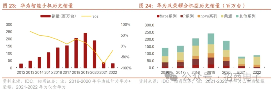 关注华为手机回归议题。据IDC,2013年华为智能手机市占率不足5%,随后华为迅速崛起,2019年成长为国内第一、全球第二智能手机品牌,销量达2.4亿台,全球市占率达近20%。分机型来看,华为高端机Mate+P系列巅峰销量高达近7500万台,Nova系列巅峰销量达近3000万台。华为Mate、P系列定位中高端,凭借自研麒麟处理器、业内领先的光学、充电、外观设计等规格,性能上可与苹果、三星等巨头的手机抗衡,Nova系列在年轻消费群体中颇受欢迎,据IDC,2019年高端机Mate+P系列销量达近7500万台,Nova系列亦可达近3000万台。但后来受5G芯片供应限制,华为手机销量迅速下滑。后来华为由于受到美国制裁,麒麟芯片生产中断,华为只能采购高通、联发科4G处理器,华为旗舰机Mate和P系列竞争力减弱并延迟发布,并于2020年11月出售掉荣耀。受供应限制后,华为手机销量下滑迅速,据IDC,2022年华为智能手机销量仅为3000余万台(Mate+P系列约880万台、Nova系列约1490万台)。 我们认为此次新机携麒麟芯片的回归对用户换机或有拉动作用,同时后续P系列新机亦有望延续Mate60/X5系列创新趋势,建议关注后续华为手机销量及新机发布情况。