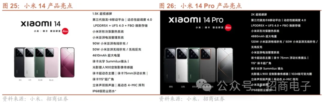 小米14首发骁龙8Gen3,14Pro含钛金属特别版,并搭载澎湃OS打造“人车家全生态体系”,销量较佳。小米14系列23M10正式发布,主要亮点:1)芯片:全球首发骁龙8Gen3,CPU 性能+32%,功耗-34%;GPU性能+34%,功耗-38%。2)外观设计:14Pro采用99%钛金属中框,双面小米龙晶玻璃覆盖。3)光学:首次搭载新一代徕卡Summilux镜头。4)屏幕:14采用6.36英寸屏幕,分辨率升级为1.5K,14 Pro采用6.73英寸2K规格的全等深微曲屏。5)系统:搭载澎湃OS打造“人车家全生态体系”。据小米官方公布,小米14系列首销销量为13系列首销总量的6倍,首销4小时打破天猫/京东/抖音/快手四大平台近一年所有国产手机“首销全天销量及销售额”纪录。雷军在23年11月7日称小米14销量已破百万,且处于严重缺货状态。