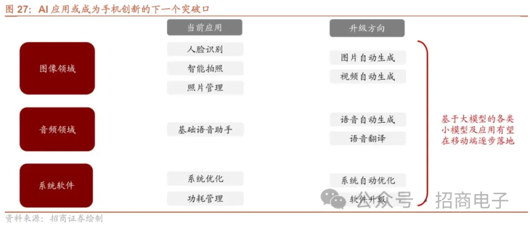 AI应用与手机融合创新空间广阔,或成为手机创新的下一个突破口。当前智能手机已经进入存量市场,创新不足导致用户换机周期延长。手机作为当前互联网的主要入口,AI应用范围不断扩大,从图像领域到语音领域、系统软件优化等。高通表示云端和边缘终端结合的混合式AI具备发展潜力,在骁龙峰会2023上高通CEO安蒙表示:“我们正在进入AI时代,终端侧生成式AI对于打造强大、快速、个性化、高效、安全和高度优化的体验至关重要。骁龙在助力塑造和把握终端侧生成式AI机遇方面独具优势,未来骁龙赋能的生成式AI体验将无处不在。”联发科亦看好边缘AI发展潜力,新品天玑9300将配备强大的AI处理单元APU,可运行生成式AI大语言模型,2024年将生成式AI功能从旗舰芯片推广至更多级别的芯片,认为采用性能强大的APU趋势将刺激手机换机需求。苹果亦在23Q3业绩会表示公司持续将 AI 技术应用于各核心产品中,并正在推进生成式 AI 的工作。我们认为混合式AI值得关注,未来基于大模型的各类小模型及应用有望在移动端逐步落地,AI与手机融合的想象空间广阔,或成为手机创新的下一个突破口。