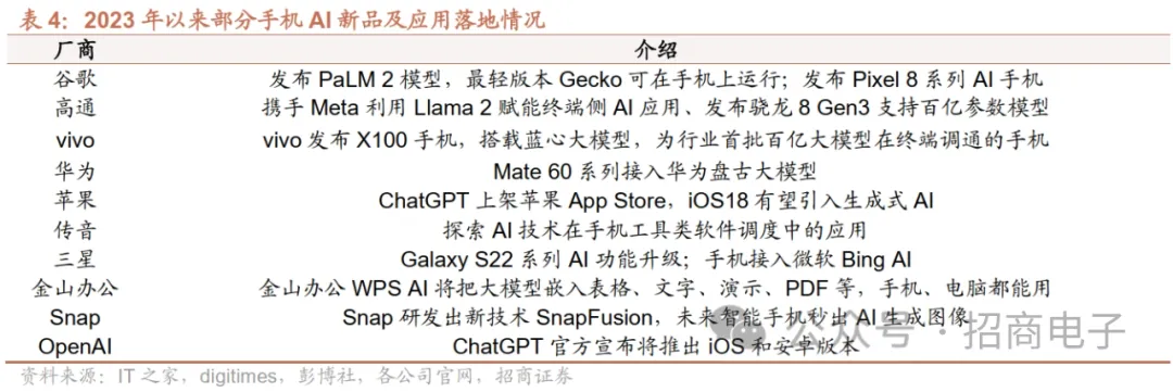 2023年以来,科技巨头发布AI手机新品,生成式AI在端侧逐步落地。高通23M10在骁龙峰会上发布全新旗舰移动平台—第三代骁龙8,是高通首个专为生成式AI而精心打造的移动平台,支持运行100亿参数的模型,并且针对70亿参数大语言模型每秒能够生成20个token,在端侧AI大模型支持、ISP、多模通信、软硬件系统架构等方面领先业界,为下一代旗舰智能机带来生成式AI。谷歌23M10亦发布旗下首款搭载大模型的手机Pixel 8系列,搭载自研的Tensor G3芯片,可以运行复杂的机器学习模型,AI处理能力大幅提升,较为强劲的AI图片处理及AI助手功能引发关注。vivo 23M11发布X100手机,搭载蓝心大模型,为行业首批百亿大模型在终端调通的手机,拥有超能语义搜索、问答、写作、创图、智慧交互等AI相关功能。