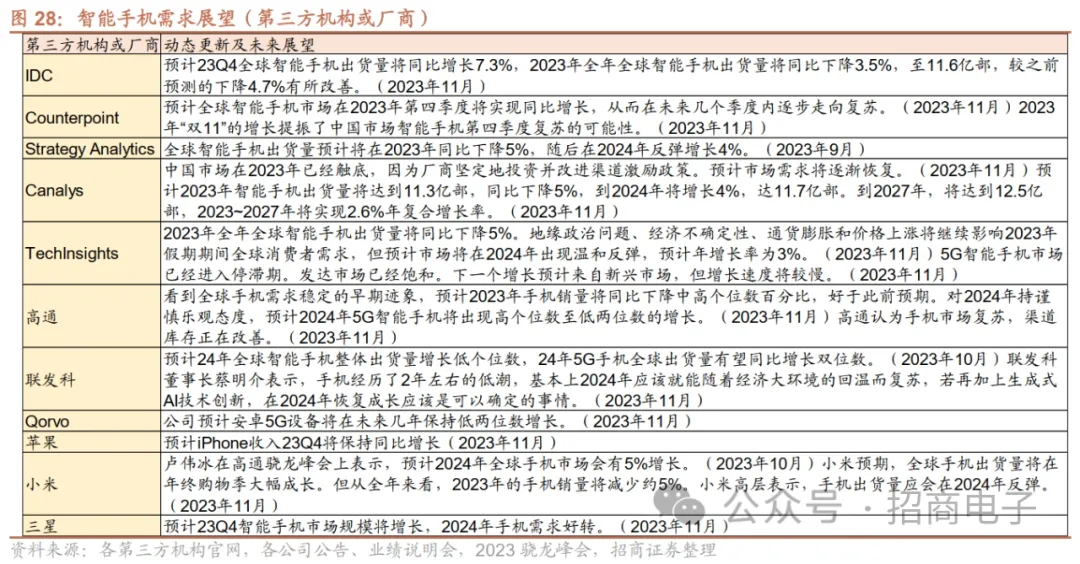 展望未来,第三方机构和手机链厂商总体认为23年手机出货量同比下降个位数,预计24年有望温和复苏实现增长。第三方机构方面,IDC预计23Q4全球智能手机出货量将同比增长7.3%,23全年全球智能手机出货量将同比下降3.5%,至11.6亿部,较之前预测的下降4.7%有所改善。Counterpoint预计全球智能手机市场23Q4将实现同比增长,并在未来几个季度内逐步走向复苏。Canalys预计23年智能手机出货量将达到11.3亿部同比下降5%,到24年将增长4%达11.7亿部。Strategy Analytics预计全球智能手机出货量23年同比下降5%,24年迎来反弹增长4%。手机链厂商方面,据23Q3业绩会,高通表示看到全球手机需求稳定的早期迹象,预计23年手机销量将同比下降中高个位数百分比,对24年持谨慎乐观态度,预计24年5G手机将出现高个位数至低两位数的增长。联发科预计24年全球智能手机整体出货量增长低个位数,24年5G手机全球出货量有望同比增长双位数。Qorvo认为安卓5G设备预计未来几年保持低两位数增长。小米总裁卢伟冰在高通骁龙峰会上表示,预计24年全球手机市场增长5%。分阵营来看,1)苹果:我们认为新款iPhone15/15Pro系列整体创新及体验均有较大提升,尤其是Pro Max系列采用钛金属弧形中框、3nm芯片以及潜望式镜头等创新升级,苹果新机全球销售表现稳健,iPhone15新机中Pro系列需求更佳。苹果在23Q3电话会表示,预计23Q4 iPhone收入将保持同比增长。2)安卓:安卓端手机库存已处在较为健康的水位,整体需求呈现环比边际复苏的态势。华为方面,基于市场需求趋势以及供应链产能,我们判断24年Mate/P/X系列出货有望达2000万以上,整体华为手机有望超6000万。