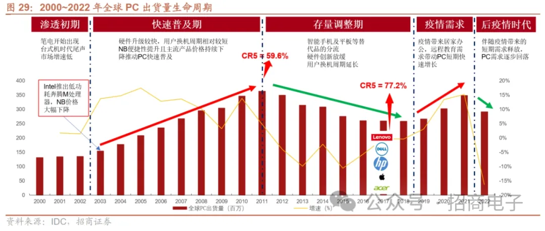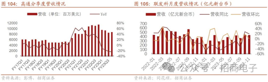 22Q2~23Q1 PC出货量同比跌幅持续扩大,但23Q2~3同比跌幅有所收窄,23M6~M11笔电代工大厂总营收同比降幅持续收窄。据IDC,20Q2~21Q1受益于疫情驱动的居家经济,全球PC出货量同比加速增长,但21Q2同比增速开始明显下滑,22Q1增速转负,22Q2~23Q1跌幅持续扩大,主要受需求不振、库存积压等因素影响。23Q2全球PC出货量6160万台,同比-13.4%/环比+8.3%,同比跌幅收窄,市场表现好于预期。23Q3同比跌幅进一步收窄,出货量6820万台,同比-7.6%环比+10.7%。中国台湾笔电代工大厂23M6开始营收同比跌幅持续收窄,23M11总营收4256亿元新台币,同比-3.2%。