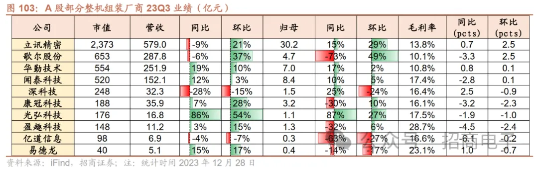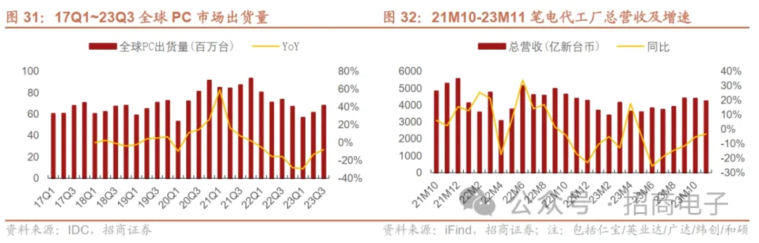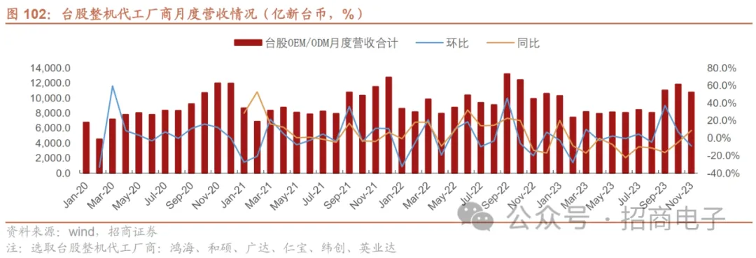 整机组装环节,当前市场主要关注:1)消费终端新机销售情况、AI等创新赋能及下游需求复苏趋势;2)Vision Pro在中长期给核心厂商带来潜在业绩弹性。我们认为在苹果产业链中,库存整体去化,目前已处于一个非常健康的状态,而受益于23Q3新机在潜望式、钛合金中框、窄边框、Type-C等技术创新,目前新机备货量较上代仍有增长,而具备平台化能力、规模效应和深度设计开发能力的公司有望受在苹果链中有机会持续“扩品类+提份额”,部分厂商业绩已在23Q3有所改善显现自身的Alpha,未来业绩有望迎来持续修复。安卓产业链中,受23H1终端需求不振影响组装业务承压,进入H2后伴随华为Mate 60/X系列及荣耀、小米等新机的陆续发布,产业链整体需求呈现环比边际复苏趋势,其中华为新机销量的增长相对最快。我们对于23Q4需求持审慎乐观的态度并认为新品的销量情况需要进一步观察。消费电子核心之一在于创新,以苹果Vision Pro为标杆的MR智能终端已开启空间计算时代的大门,此外在AI大模型技术的加持下,未来有望掀起新一轮创新大周期。Vision Pro产品性能及体验目前较市面现有产品至少领先2-3年,伴随后续的降本以及应用生态的不断完善,长期销量有望达到数百甚至千万级别,这将给头部核心供应商带来长线弹性利润空间。台湾代表厂商月度数据跟踪:从台股6家头部整机厂月度数据来看,23年11月整机厂合计营收10756亿新台币,同比+8.6%环比-8.9%,整体同比提速,且AI服务器相关业务预期较佳。1)鸿海:23Q3收入15428亿新台币同比-11.7%环比+18.4%,23年10/11月7412/6500亿新台币同比-4.6%/+18.0%环比+12.2%/-12.3%,从最新月度数据来看,公司环比下滑主因前期新品拉货需求、中国双11及北美感恩节,下游客户提前铺货,消费智能产品及PC终端产品、元器件产品基数较高,云端网络产品客户本月拉货动能保守。展望23Q4,基于已经进入下半年旺季,公司认为营运将逐渐加温,预估Q4环比将显著成长,优于此前预期;2)和硕:23Q3收入3158亿新台币同比-10.5%环比+12.5%,23年10/11月1422.0/1167.8亿新台币同比+7.9%/+2.9%环比+7.1%/-17.9%,公司11月环比下滑主因消费电子Q3旺季拉货后下游订单动能趋缓,公司仍看好车用及5G市场发展潜力,AI持续赋能泛IoT产品有望催生新的市场需求,公司预计24年消费终端需求将优于23年,预期增速在个位数水平;3)广达:23Q3收入2865亿新台币同比-25.0%环比+16.9%,23年10/11月913.9/1036.0亿新台币同比-16.0%/-7.6%环比-7.0%/+13.4%,11月同比下滑主因NB及AI服务器出货量增加难抵其他消费电子业务下滑,公司对于Q4 NB市场的展望趋于保守,全年NB出货量将下滑2成,服务器方面,23Q4 AI服务器订单能见度高,但仍受限于GPU供应,预计23年公司服务器营收保持个位数增长,24年展望更加乐观;4)仁宝:23Q3收入2517亿新台币同比-13.5%环比+3.2%,23年10/11月收入874.9/846.4亿新台币同比-7.8%/+4.1%环比+2.8%/-3.3%,公司表示23Q3 NB出货量符合预期,消费电子需求受益新品备货,展望23Q4客户订单能见度偏低,整体需求情况不够明朗;5)纬创:23Q3收入2185亿新台币同比-12.6%环比+5.8%,23年10/11月营收784.0/764.4亿新台币同比-0.3%/持平环比+6.8%/+9.3%,公司预计23Q4 NB、显示器及DT出货情况环比持平,服务器仍以AI服务器需求仍向好;6)英业达:23Q3收入1358亿新台币同比-4.6%环比+4.0%,23年10/11月营收404.0/441.4亿新台币同比-19.7%/+8.6%环比-15.0%/-8.9%,公司预计NB因23Q3客户提前拉货,23Q4出货环比将下滑双位数,全年NB出货量下滑个位数,服务器方面,AI服务器需求旺盛,但企业服务器需求没有恢复,全年预计服务器业务下滑个位数,其中AI服务器占比将达15%,24年将增长双位数。
