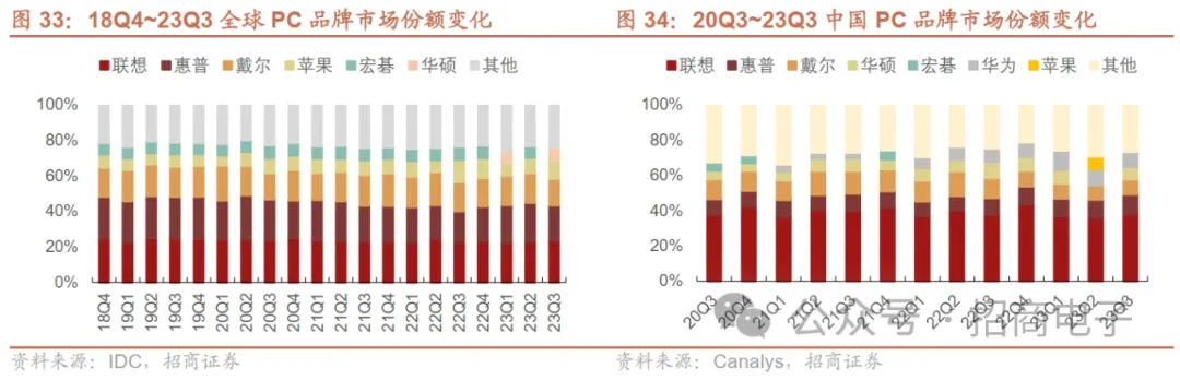 分品牌来看,23Q3苹果同比下滑较大因22Q2基数较高,惠普增长主要归功于库存正常化。据IDC,23Q2全球PC出货量Top5为联想、惠普、戴尔、苹果、华硕,份额分别为23.5%、19.8%、15.0%、10.6%、7.1%,同比-5.0%、6.4%、-14.3%、-23.1%、-10.7%,苹果下滑较大因22年Q2受疫情影响导致供应中断,而23Q3供给恢复造成22年同期基数较高,惠普恢复增长主要归功于库存调整至接近正常水平。