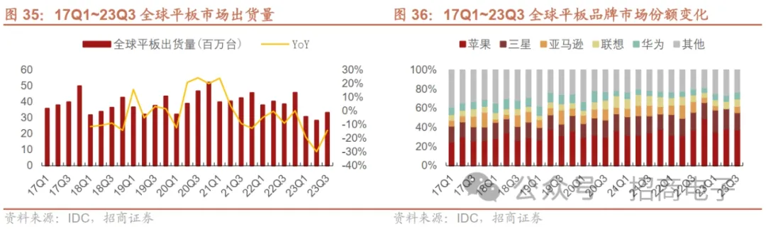 平板电脑方面,23Q1~23Q3出货量逐步回落,趋近至疫情前水平。疫情带来的短期需求逐步释放,23Q1~23Q3平板需求逐步回落,据IDC,23Q1全球平板电脑出货量3070万台,同比-19.1%环比-32.8%,出货量水平与疫情前19Q1的3010万台相当,23Q2全球平板电脑出货量2830万台,23Q3出货量3320万台,同比-14.2%环比+18%,趋近至疫情前18Q3和19Q3的出货量水平。 分品牌来看,23Q3 Top5品牌均同比下滑,苹果、三星继续领跑市场。据IDC,23Q2 Top5品牌苹果、三星、联想、华为、小米出货量分别为1250/600/260/230/220万台,分别同比-15.1%/-17.1%/-4.2%/-5.7%/-49.5%,苹果、三星继续领跑市场,合计占据了平板电脑市场超55%的份额。
