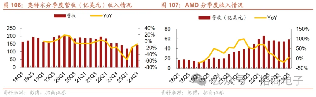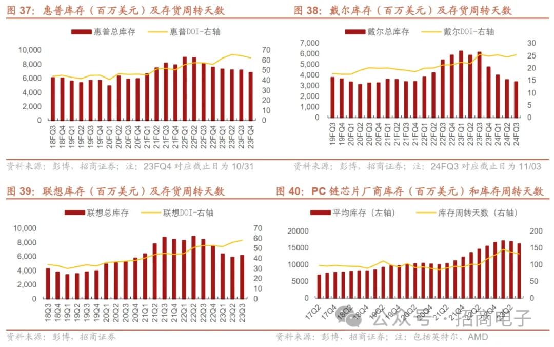 库存端来看,PC终端厂商认为库存目前整体趋于正常。戴尔:根据戴尔FY24Q2电话会信息,公司第二季度环比减少了4亿美元的库存,对于FY24Q3,公司展望库存水平有望更加正常化,但是竞争环境将更加激烈。惠普:根据FY23Q3电话会信息,公司FY23Q3库存周转天数环比减少了1天,公司的渠道库存水平正在正常化。PC链芯片厂商英特尔、AMD 23Q3库存和库存周转天数环比持续下降,库存趋势进一步好转。根据彭博数据取临近两季度库存平均算法,以英特尔、AMD为例,两家公司平均库存连续第二个季度实现环比下降,23Q3环比降低7亿美元达到162亿美元,23Q3库存周转天数环比降低5天达到132天。英特尔23Q3法说会表示23Q3库存环比减少5亿美元。AMD 23Q3法说会表示由于疫情期间的交付时间和市场需求旺盛所致公司库存水平较高,随着交付时间的正常化,PC市场库存水平趋于正常化,需求开始回归季节性模式。