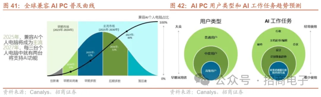创新方面,兼容AI功能的PC或改变人类工作方式,Canalys预测2027年将有60%的PC兼容AI功能。Canalys认为兼容AI的新一代PC将改变我们的工作方式。混合云计算和本地计算将使人们能够大幅提高工作效率,释放自身的创造力。这将推动向“AI PC”时代的转变,从而大大提高性能、安全性和个性化。Canalys预测,初期兼容AI PC的应用仅限于特定的业务职能和需要强大硬件来运行高强度AI工作的专业技术人员。但在未来的五年里,优化后的大语言模型和AI工具市场的出现,以及融入强大AI集成的全新操作系统将促进兼容AI PC的普及。随着软件技术的迎头赶上,充分利用兼容AI PC的采用将在2025年加快上升,而届时也正是第二代AI PC的面世,与预测的市场更换周期吻合。兼容AI的PC的部署将稳步扩展到其他业务部门。Canalys预测,到2027年60%的PC将兼容AI。