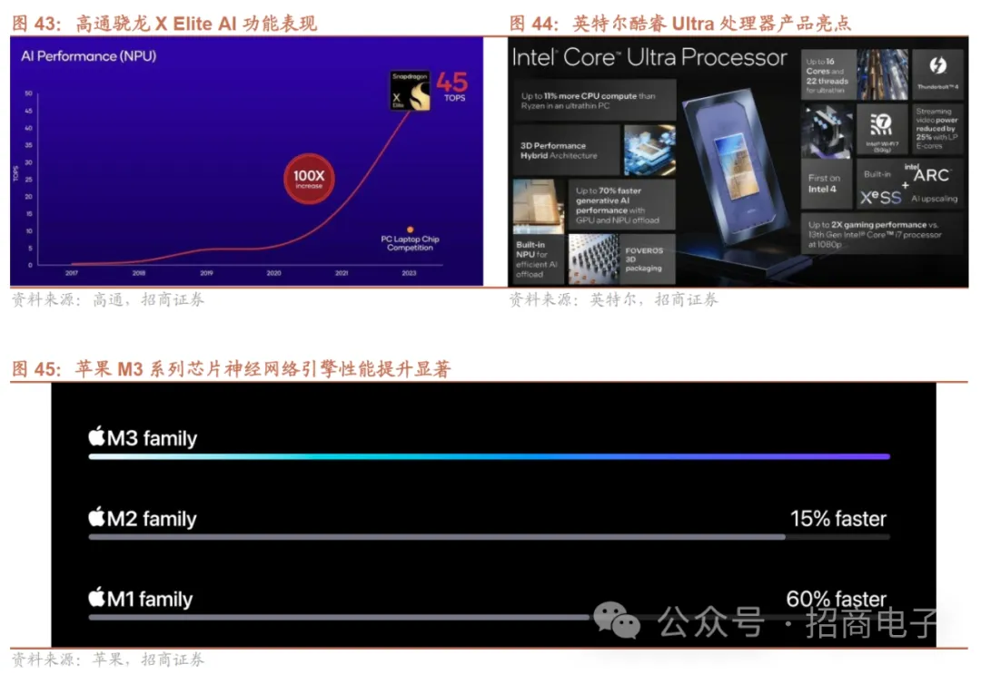联想已联合多厂商展示AI PC,Intel、高通推出专为AI大模型打造的PC处理器,苹果M3系列芯片AI性能亦大幅升级,AI PC有望24年正式推出。联想23M10在以“AI for All”为主题的联想Tech World 2023大会展示了首款AI PC,重新定义生产力工具。AI PC能够创建个性化的本地知识库,用大模型压缩技术在离线状态下运行个人大模型,实现AI自然交互。AI PC是为每个人量身定制的全新智能生产力工具,可以学习用户的思维模式来完成任务,设备就好像是用户的数字延伸,联想称之为“AI Twin”。高通在23M10底骁龙峰会上推出专为AI打造的新平台—骁龙X Elite,支持在终端侧运行超过130亿参数的生成式AI模型,拥有快达竞品4.5倍的AI处理速度,OEM厂商预计将于2024年中推出搭载骁龙X Elite的PC。苹果23M11初发布的M3/M3 Pro/M3 Max芯片引入增强型神经网络引擎,用于加速强大机器学习模型,与M1系列芯片相比,新的神经网络引擎带来最高达60%速度提升,可运行包含数十亿个参数的 Transformer模型。英特尔23M12推出新型酷睿Ultra处理器,专为支持人工智能技术而设计。