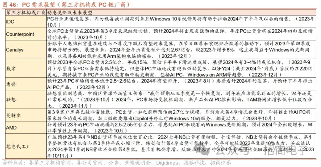 展望未来,PC产业链厂商和第三方机构总体认为23年全年PC出货量下降约10%至2.5~2.7亿台,2024年受AI PC和Windows更新周期驱动有望温和复苏。PC链芯片厂商方面,据23Q3业绩会信息,英特尔认为第3季客户库存已经非常健康,23年PC出货2.7亿台,预计23Q4情况更好,同时即将推出的AI PC将带来数年的成长周期,加上微软要推出Copilot并终止对Windows 10的服务,将助力换机需求。AMD预计23年PC市场规模约2.5-2.55亿台左右,考虑到AI PC和现有的Windows更新周期,预计24年会出现增长,回归季节性上升周期。笔电代工厂方面,广达预估24年NB出货有望持稳。仁宝评估,NB出货将会个位数季减,23Q4营收与Q3持平或小幅下滑。纬创估计23Q4出货可能持平,全年较2022年衰退10%左右。英业达认为24Q1的NB营收不会较23Q4低,甚至有机会环比提升,反映品牌客户对24年普遍预估会回温的产业趋势。第三方机构方面,IDC认为PC行业正缓慢复苏,因为设备换机周期到来且Windows 10系统停用将有助于推动24年下半年及以后的销售。Counterpoint预计24年将出现更强劲的反弹,PC年度出货量将在24年回归至疫情前的水平。Canalys认为全球PC出货量在连续七个季度下跌后有望迎来复苏。在节日旺季和宏观经济改善的推动下,预计23Q4市场将增长5%,24全年出货量预计达到2.67亿台,较23年增长8%,主要得益于Windows的更新周期,以及具备AI功能和采用Arm架构电脑的崛起。
