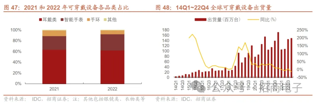 平板电脑方面,IDC预计2023年出货量同比-17.1%至1.34亿台。疫情期间线上教学、办公需求大幅增加,平板迎来短期爆发式增长。伴随疫情带来的短期需求已逐步释放,平板需求将逐步回落。IDC预计2023年平板出货量1.34亿台,同比-17.1%。三星在23Q3电话会表示,预计与2021年远程办公和教育相关的高需求相比,2022~2023年平板电脑市场出现萎缩,但随着换机周期临近,预计2024年平板电脑市场也将出现好转,增长将集中在高端市场。3、可穿戴:23全年温和复苏,关注海外新兴市场和AI穿戴创新TWS、智能手表、手环是可穿戴设备三大单品,TWS、智能手表仍处于渗透率提升的阶段。广义的可穿戴设备主要涵盖耳戴设备、智能手表、手环、XR以及衣物类等其他品类。据IDC,耳戴设备、智能手表、手环为三大主要单品,2022年占比分别为62.3%、30.2%、7.1%,其中耳戴设备以TWS为主,还包括头戴式、颈戴式等耳机。其中,TWS、智能手表渗透率仍有较大提升空间。2022年全球可穿戴出货量同比-7.7%至4.92亿台,首次出现负成长,仅智能手表品类实现正增长。据IDC,2022年全年可穿戴设备出货量同比下降7.7%至4.92亿台,出货量首次出现负增长,主因全球经济环境形势严峻、消费者需求放缓。分类别来看,2022年耳戴式设备同比下降近10%,而手环出货量也因智能手表的竞争挤压而持续下降,仅智能手表实现增长。