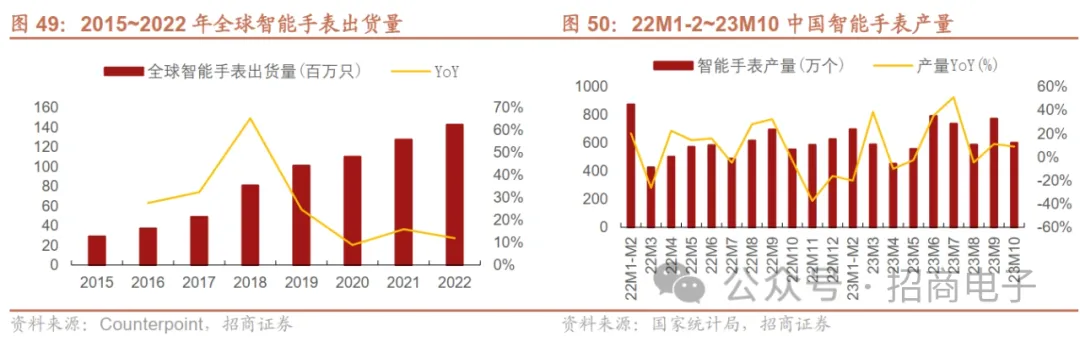 本节我们重点分析智能手表、TWS两大品类,XR第四节单独分析。总体来看,智能手表、TWS需求经历23Q4~23Q1连续两个季度出货量同比下滑后,23Q2需求有所回暖,出货量同比增速回正,23Q3延续复苏趋势。23年全年可穿戴出货量有望实现温和增长。分地区看,23年印度等海外新兴市场可穿戴需求表现强劲,主要受益于中低端TWS、智能手表需求的增长。智能手表经历了连续2个季度的出货量同比下滑之后,23Q2出货量恢复增长,23Q3延续复苏趋势实现同比双位数增长。据Counterpoint,22Q4智能手表出货量同比下降8%,为八个季度以来首次出现负增长,主因通胀压力、印度市场增长放缓。但由于前三个季度的强劲同比增长,2022年全球智能手表出货量逆势增长12%至约1.43亿只。23Q1智能手表需求并未反弹,出货量同比小幅下滑。但经历了连续2个季度的下滑之后,全球智能手表出货量23Q2恢复增长,同比增长11%,23Q3延续复苏趋势,出货量同比增长11%,达到3500万只。据国家统计局数据,23年1~5月中国智能手表产量同比下滑,6月开始回升。