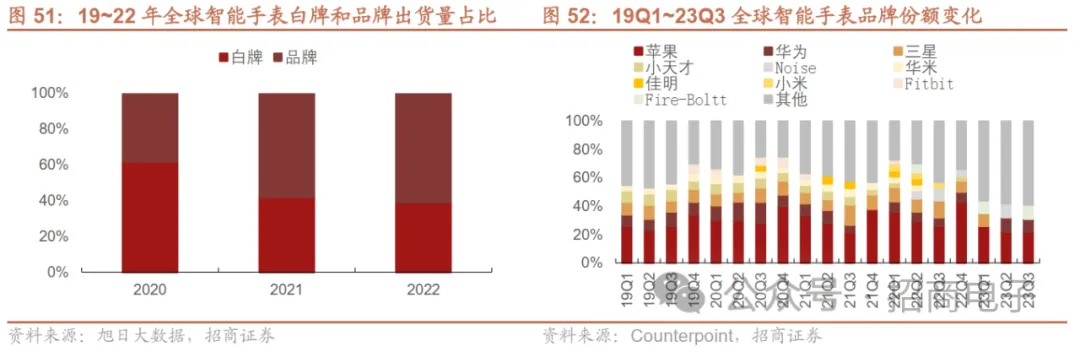 目前智能手表行业整体处于“苹果一超多强、白牌丛生”的局面。苹果领跑智能手表市场,据Counterpoint,2022年苹果市场份额为34.1%,第二梯队厂商为三星、华为,分别占比为9.8%和6.7%,其后的厂商更加分散且更迭频繁。据旭日大数据,白牌占比呈下降趋势,但占比仍高,2022年达39%。23Q3华为表现较为突出,三星表现有所下滑。据Counterpoint,23Q3苹果、Fire Boltt、华为出货量前三,份额分别为22%、10%、9%。其中华为表现较为突出,主要得益于新品Watch 4/GT4系列、华为手机的回归和捆绑销售模式;三星表现有所下滑跌出前三,主因传统型号出货量大幅下降。
