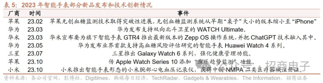 新品和创新方面,关注智能手表大健康功能的迭代升级、AI赋能技术创新。运动管理、健康检测为智能手表的核心功能,苹果为首的科技厂商持续在运动、健康领域加大投入,建议持续关注新品运动管理(数据分析、运动姿态检测、导航精度升级等)、健康检测(血压、血糖等)功能的迭代升级和AI赋能带来的应用创新(个性化的计划等)。23M5华为发布业界首款支持高血糖风险评估研究的智能手表Huawei Watch 4系列。23M10小米推出智能手表形态的小米腕部心电血压记录仪,获得中国NMPA二类医疗器械注册证。此外据彭博消息,Apple Watch Series 10或添加“血压趋势监测”功能。