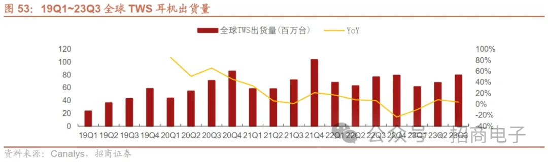 TWS 23Q2出货量同比增速回正,23Q3延续复苏。据Canalys,22Q4~23Q1 TWS出货量连续两个季度同比下滑,主要受消费需求疲软影响,但23Q2需求有所回升,出货量达6816万台,同比+8.2%,23Q3延续温和复苏趋势,出货量7990万台,同比+3.9%。