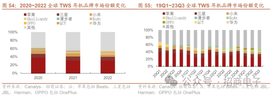 TWS与智能手表竞争格局相似,呈现苹果一超多强的竞争格局。品牌厂商当中,苹果在出货量上明显领先于其他厂商,据Canalys数据,2022年苹果TWS耳机出货量占市场份额的32%,其他主要品牌为三星、小米等,同时较低端的白牌TWS耳机在出货量上仍然较多,2022年占到46%。23Q3苹果、三星出货量同比有所下滑,印度品牌boAt和小米表现较佳。23Q3苹果以27%的市场份额仍位列第一,但出货量下降8.3%。三星以8%市场份额排名第二,出货量下降9.5%。印度品牌boAt和小米均有两位数的增长,并分别以7%和5%的市场份额位列第三和第四。Skullcandy的出货量下降1%。