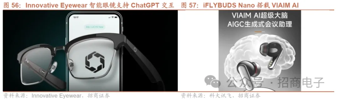 AIGC驱动TWS成为随身AI语音助手,有望成为行业下一创新重点。AI大模型有望助力TWS耳机基于AI算法的相关功能(翻译/听写、自适应主动降噪、通话降噪、个性化空间音频)持续创新,持续关注音频类可穿戴设备作为随身AI语音助手的成长空间。23M4 Lucyd发布LucydAPP,该APP是首个接入Open AI平台的语音助手,支持以语音方式和Chatgpt进行交互,不需要键入文字和解锁手机屏幕。23M5科大讯飞发布的iFLYBUDS Nano系列出厂搭载未来智能的AI生成式会议办公效率工具VIAIM AI。