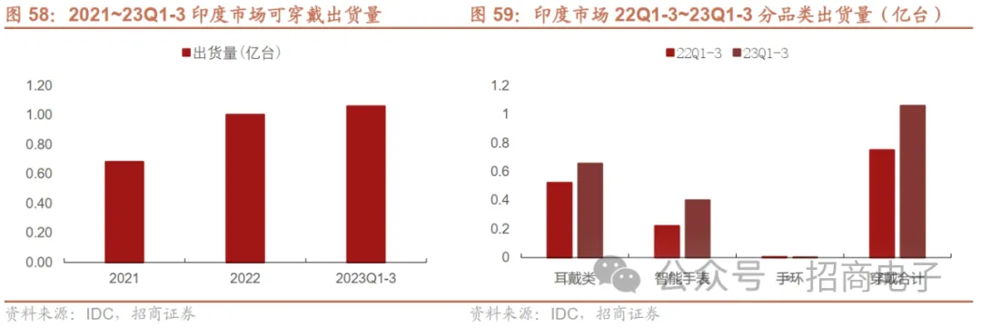 分地区看,2023年前三季度印度、非洲等海外新兴市场穿戴需求表现强劲,主要受益于中低端TWS、智能手表需求的增长。以印度为例,据IDC数据,2023年上半年印度可穿戴设备出货量同比强劲增长53.3%达5780万台,23Q2可穿戴设备的ASP从22年同期的26.7美元降至21.0美元。23Q2智能手表的ASP下降44.9%至25.6美元。在耳戴式耳机类别中,颈带和TWS的平均售价分别为15.0美元和18.7美元,分别下降6.4%和15.3%。印度市场23Q3穿戴出货量达到创纪录的4810万台,同比增长29.2%。2023年前三个季度的出货量为1.059亿部,超过了2022年的1.010亿部。