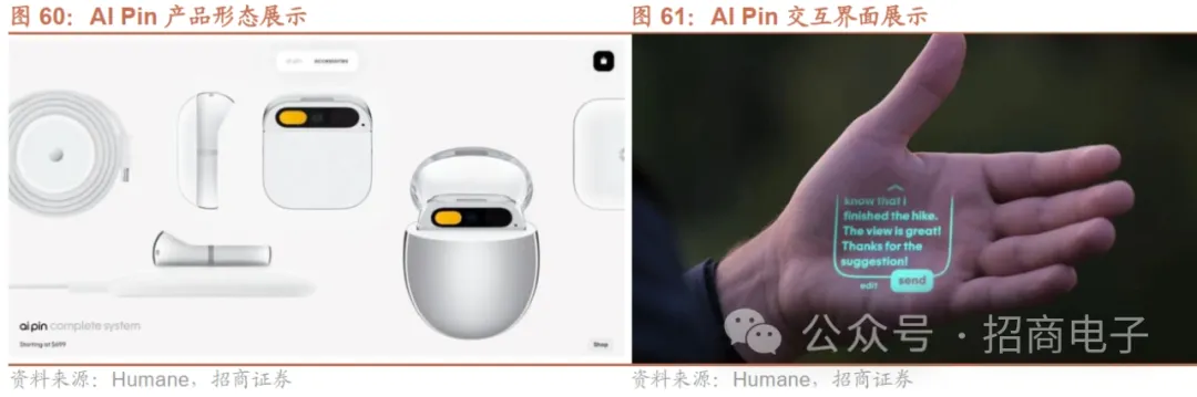 其他新品创新方面,Humane发布的穿戴式AI设备AI Pin引发市场关注。23M11 Humane发布了AI Pin穿戴式AI设备,是一种安置在服饰上的微型投影,通过投屏在手掌上进行交互,在AI模型助力下,可执行写文稿、听音乐、实时翻译等任务,这款产品凭借其独特的设计和功能,获得了OpenAI、微软等知名企业的支持。主要亮点包括:1)融入AI 能力:Ai Pin配备了类似ChatGPT的AI聊天助手Ai Mic,其定位为AI助理,内置AI大模型。2)无需唤醒词的语音控制:AI Pin时刻在线,无需任何唤醒词即可激活。通过语音控制操作,并能投影显示AI驱动的交互界面。3)激光投影与显示技术:配备激光墨显示技术,能在任何近处表面(如手掌或桌面)投影出文本、图形和UI元素。4)信任灯功能:配备有一个信任灯,当设备的摄像头、麦克风或其他传感器记录数据时,AI Pin会亮起,为用户提供安全与透明感。AI Pin售价为699美元,每月需要额外支付24美元订阅费。