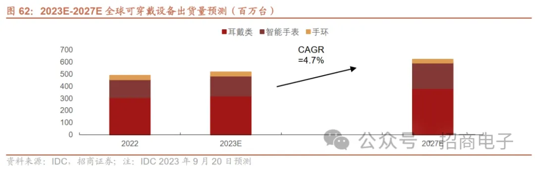 2023年智能手表、TWS温和增长,看好未来中长期成长空间。智能手表方面,我们认为智能手表渗透率仍低,未来有望受益于运动、健康功能不断完善而持续成长。TWS方面,我们认为全球中低端TWS市场仍然具备较大的渗透率提升空间,2022年疫情、通胀等原因导致下游TWS需求疲软,2023年逐步从下行中复苏,其中白牌TWS市场有望持续复苏。据IDC预计,2023年全球可穿戴设备出货量同比+5.6%至5.198亿台,其中耳戴类(TWS为主)同比+4.5%、智能手表同比+11.3%,手环同比-8.8%;22~27年出货量GAGR为4.7%,其中耳戴类、智能手表、手环CAGR分别为 4.5%、6.3%和-2.2%。三星在23Q3电话会表示,考虑到换机周期、发达市场的健康相关需求增长以及新兴市场渗透率的不断提高,预计2024年智能手表市场将实现两位数的增长。2024年TWS市场预计将小幅增长,增长点主要在新兴市场的扩张。