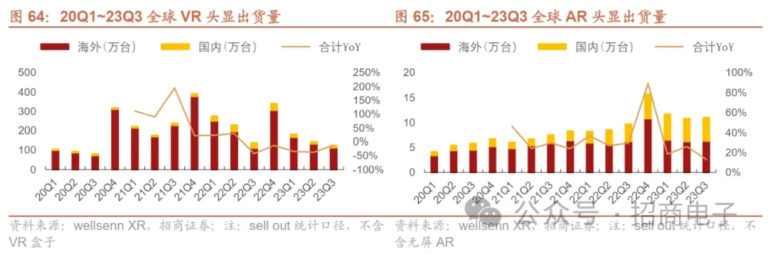 22Q3~23Q3 VR出货量连续第5个季度同比下滑。据wellsenn XR,23Q3全球VR出货量123万台,同比-12%环比-15%,销量下滑主因:Meta Quest 2产品老旧,Quest Pro性价比低,Meta系头显销量逐渐下滑;此外Pico、PSVR2等C端VR三季度也出现了销量环比下滑趋势。23Q3 AR出货量延续增长趋势,主要受益于消费级观影产品贡献。23Q3全球AR出货量11万台,同比+13%环比+2%,销量增长主要来自于中国AR品牌贡献,三季度Xreal Air 2、影目Go等新品上市发售,以及雷鸟、Rokid、Viture等消费级观影AR眼镜是主要增量来源。