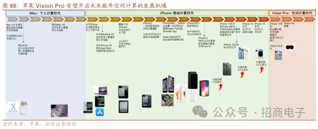 新机方面,苹果发布Vision Pro,空间计算的iPhone时刻已至。2023年6月6日,苹果发布Vision Pro头显及visionOS,实现了性能、沉浸感和功能的高度融合。Vision Pro在性能、显示、交互、音频、外观设计等方面显著优于同行;visionOS是首款空间计算操作系统,强大的开发者生态有望助力内容创新。硬件:性能、显示、交互、音频、外观设计等方面引领创新。1)性能:M2+R1双芯设计,计算性能显著超出同行;2)显示:单眼4K Micro OLED屏幕+定制3片式Pancake;3)交互:Vision Pro配备12摄像头+5传感器+6麦克风,实现脱离手柄的眼神+手势+语音交互。文本输入支持悬空虚拟键盘、外接蓝牙键盘和游戏手柄。同时,搭载外屏EyeSight功能,双向透视提升社交便利性,以及具备全彩透视功能;4)IPD:搭载无极单目IPD;5)音频:采用全新空间音频技术;6)电池:插电支持全天候使用,外接电池方案提升佩戴舒适度;7)外观:外观优雅紧凑,外形类似滑雪镜,由3D玻璃前盖、铝制边框以及轻质眼罩和边带构成。应用:支持第三方内容应用,发布至今应用生态持续完善。在WWDC 2023大会上,苹果展示了Vision Pro在B端和C端应用上带来的非凡体验,总体上B端主要集中在生产力提升以及医疗教育、工业设计等诸多商业场景,而C端应用视频、社交、影视、游戏为主要场景。Vision Pro头显支持Unity应用和兼容迪士尼Disney+流媒体服务。23M11苹果向用户推送了iOS17.2开发者预览版Beta 2更新,主要引入一项新功能,可以让iPhone15 Pro系列录制空间视频,以便于在即将推出的Vision Pro头显中查看。此外,苹果23M11开始加强Vision Pro的企业市场开发应用的宣传,在官网新增了“通过Apple Vision Pro重塑企业App”,同时Apple TV列出了一系列支持Vision Pro的3D观影。库克在23Q3电话会上亦表示全球基于Vision Pro开发的应用正不断的涌现。系统:首款空间计算操作系统,助力开发者内容创新。VisionOS是首款为空间计算打造的操作系统,满足低时延要求、多应用3D引擎、应用生态的扩展,完美兼容现有生态应用。在XR应用上,苹果布局开发者工具包多年。VisionOS基础架构主要基于SwiftUI、RealityKit、ARKit几大框架,开发工具则包括Xcode、Reality Composer Pro和Unity。23Q4苹果Vision Pro产业链已进入量产,长期来看苹果XR产品体系成长空间广阔。我们认为苹果Vision Pro在空间计算赛道上具备开创意义,解决众多技术难题,相对竞品优势碾压,类比之前iPhone4的Retina屏,在苹果定义好Vision系列软硬件规格和开发工具后,随之衍生的各种2B2C、AIGC场景应用内容会逐渐丰富,且后续产品会持续进行产品和价格迭代优化,考虑整体苹果生态赋能,我们看好苹果MR产品长线发展。根据我们跟踪,Vision Pro组装及零部件供应链正式量产已于23Q4开始,今年1月下旬有望开启预售,如市场反响比较好,有望继续扩产,24年全年销量有望达百万级。