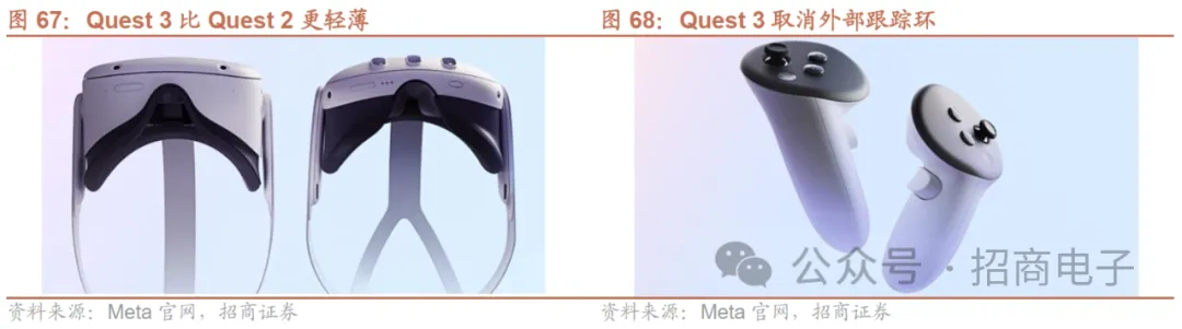 Quest 3于23M10正式开售,关注新机销售情况。Quest3新品性能提升较大,显示方面支持全彩透视且分辨率亦提升30%,光学方面采用Pancake,较上代减薄40%,传感器方面增加一颗3D深感摄像头,处理器方面采用全新骁龙XR2 Gen2,图形性能达先前产品的两倍,手柄方面Quest 3手柄重新设计,取消了外部跟踪环,还支持TruTouch触觉技术。应用方面,除游戏、直播外,Quest 3亦将兼容多款办公应用,同时Meta AI也将登录Quest3。我们认为Quest 3 MR的定位,硬件较大的升级,以及应用拓展至办公+AI等场景带来的用户体验改善值得关注,建议持续跟踪新机销售情况。此外,腾讯24年底有望引入Meta平价款VR进入中国大陆市场值得关注。据华尔街日报23M11报道,腾讯与Meta达成初步协议,将在中国销售其新的平价款VR头显。此前Meta Quest产品并未在中国大陆官方渠道发售,Meta有望重返中国大陆市场,我们认为平价款在国内发售值得关注。