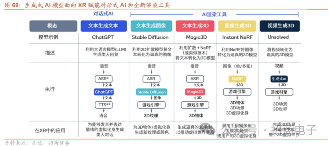 AI有望从硬件、内容两个方面赋能XR行业,带动行业加速成长。硬件:AI算法有望持续提升XR感知交互体验。为了提升XR的感知交互体验,持续改进硬件和AI算法至关重要。XR设备需要快速准确地识别和理解真实世界信息,以便在真实和虚拟世界之间进行有效交互。AI可以利用计算机视觉算法和深度理解技术,高效地还原真实环境,并优化眼动追踪、裸手交互、面部识别等多种感知交互体验,以提高XR设备的性能和用户体验。内容:AIGC技术赋能3D内容创作,丰富了内容端的供给。过去,XR游戏、视频等内容的制作成本一直居高不下,是行业发展的重要制约因素之一。AIGC的问世使得内容创作领域实现了量质齐飞的飞跃,大模型可以快速生成大量内容,且在质量和效率方面不逊于人类。未来,通过运用AIGC技术,创作者能够更加高效地处理和编辑大量的3D模型、纹理和动画等素材,从而提高了制作效率和降低了制作成本。同时AIGC技术可以自动化部分创作流程,例如自动生成虚拟场景、人物和物体等,从而提高了创作质量和效率。