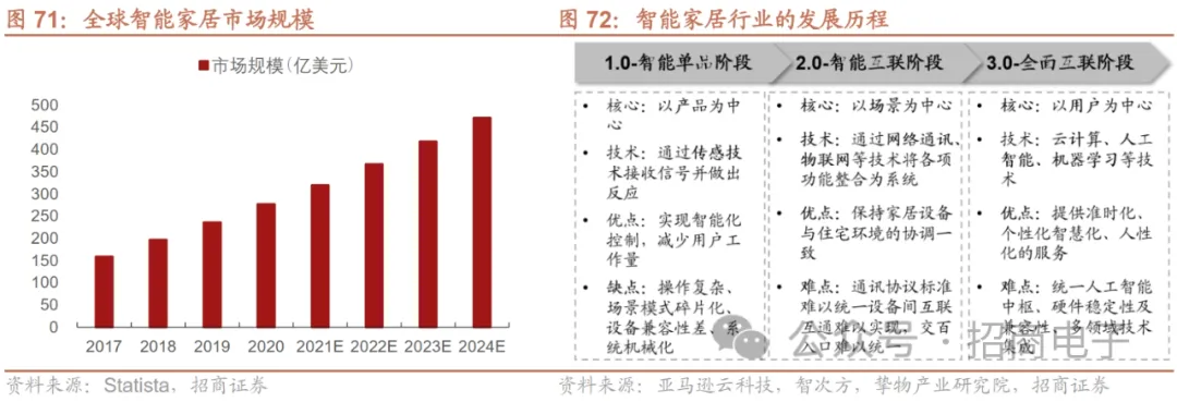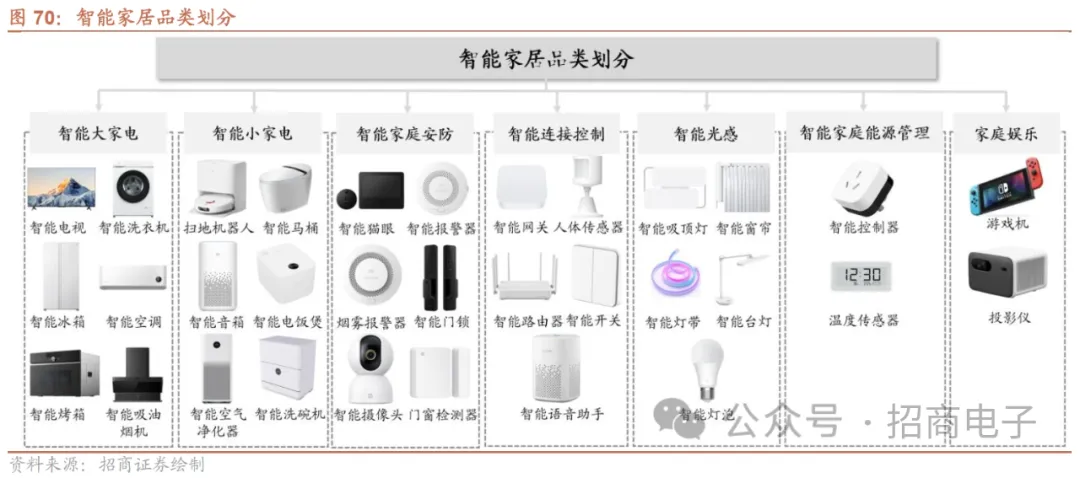 展望未来,VR方面,wellsenn XR下调2023年全球VR销量预测,预计全球VR销量710万台,同比下滑28%,VR市场仍集中在游戏场景,四季度Quest 3发售预计仍是存量用户更新升级,销量预期展望150-180万台,24年开售的苹果Vision Pro对23年VR潜在购买用户带来较强的观望情绪,预计2023年Meta销量 500万台、PS VR2 120万台、Pico 30万台。AR方面,wellsenn XR预计2023年全球AR销量为50万台,同比增长19%,其中观影类AR眼镜仍是主要增长来源,增长主力来自于雷鸟、Nreal、Rokid、Viture、华为、荣耀、努比亚等品牌观影AR眼镜,信息提示类眼镜和B端市场预计亦有部分贡献。我们认为苹果发布Vision Pro后,MR行业有望迎来新一轮增长机遇,AR眼镜的早期形态亦在持续迭代,同时AIGC技术的兴起有望深度赋能硬件及内容,加速XR行业发展。5、智能家居:23年各品类需求分化,AI有望加速行业进入全面互联新阶段智能家居互联互通,通常以智能音箱/中控平板作为交互入口,控制电视、摄像头、扫地机器人、空调、照明等智能终端。