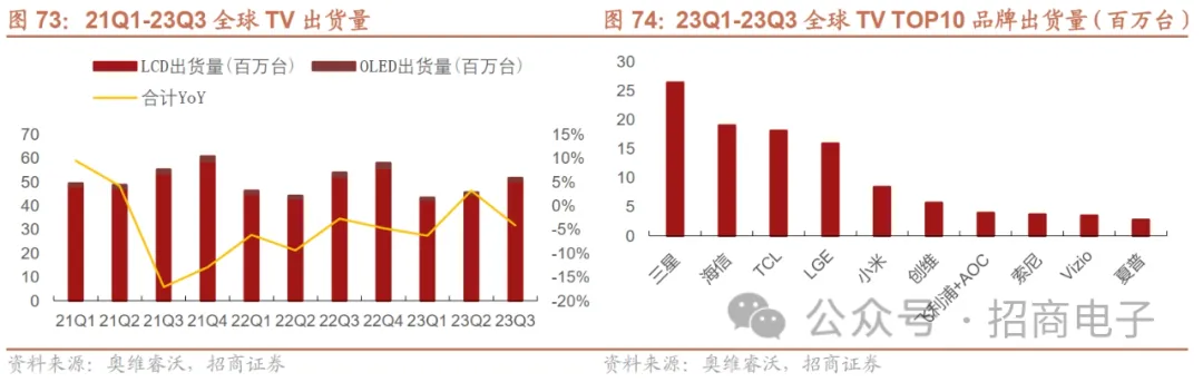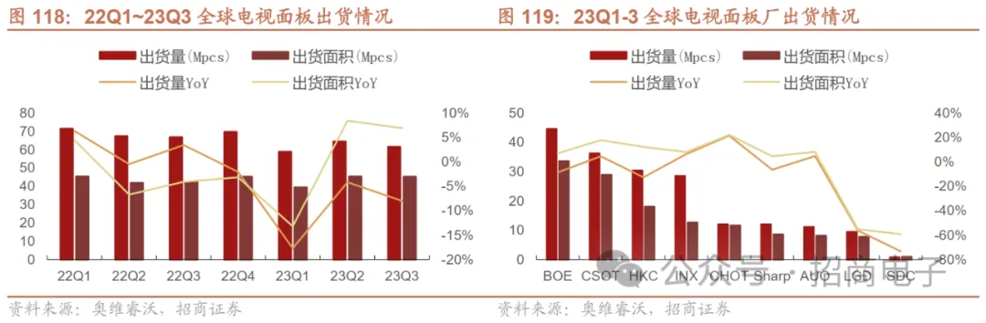 面板需求下调,面板厂再次坚定控产,23Q3 TV面板出货量同比下降8%。据奥维睿沃,2023年在TV需求端持续低迷,同时在面板厂自身持续大幅亏损的情况下,面板厂改变经营策略,以利润为导向,通过持续控产的方式,拉动面板价格恢复上涨,23Q3 TV面板出货61.4M,同环比分别下降8.0%、4.7%,但大尺寸化的持续推进,出货面积达45.2M㎡,同比上涨6.9%、环比基本持平,平均出货尺寸51.7寸,同环比涨幅分别为3.7寸、1.2寸。2023年前三个季度累计全球TV面板出货量184.7M,同比下降10.1%;出货面积129.9M㎡,同比持平微涨。从面板厂出货来看,大陆面板厂LCD产能占比接近70%,23年一直严格控制稼动,对品牌厂在价格态度上表现强硬,最终大陆面板厂出货量同比下降。而全球最大电视品牌厂三星电子将更多的订单转移到台厂和日厂,以减少对大陆面板厂的依赖,而台厂在面板价格恢复到盈亏平衡以后,稼动率恢复较快,INX、AUO和Sharp出货也同比大幅上涨。